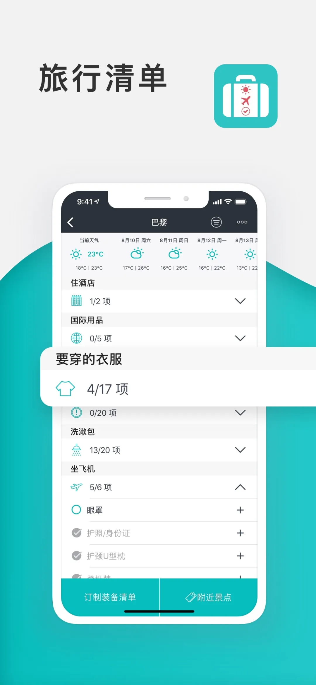 根据行程长短,天气和计划的活动项目,您的旅行清单将自动生成。这将是您夏天度假,周末休闲,公务出行,自驾旅行和露营计划的最佳帮手。