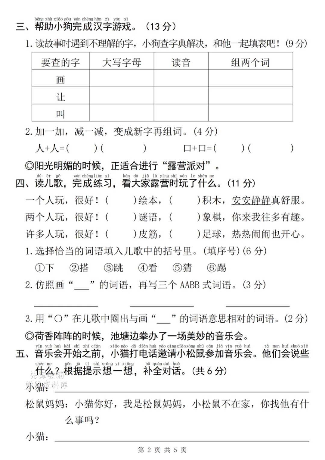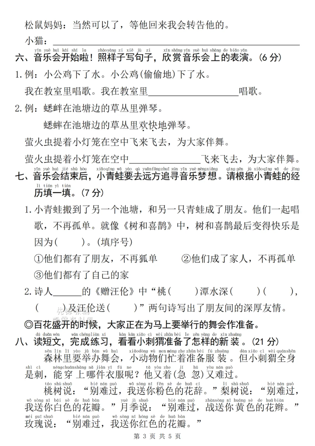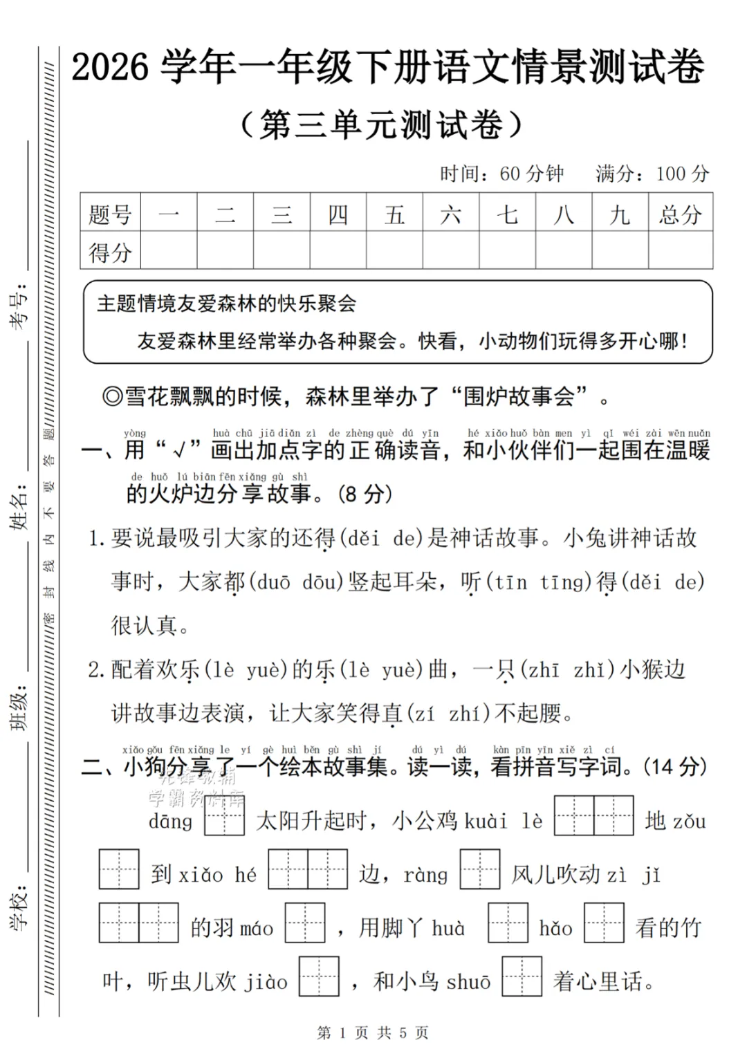 一年级下册语文第三单元情景测 电子版可打印