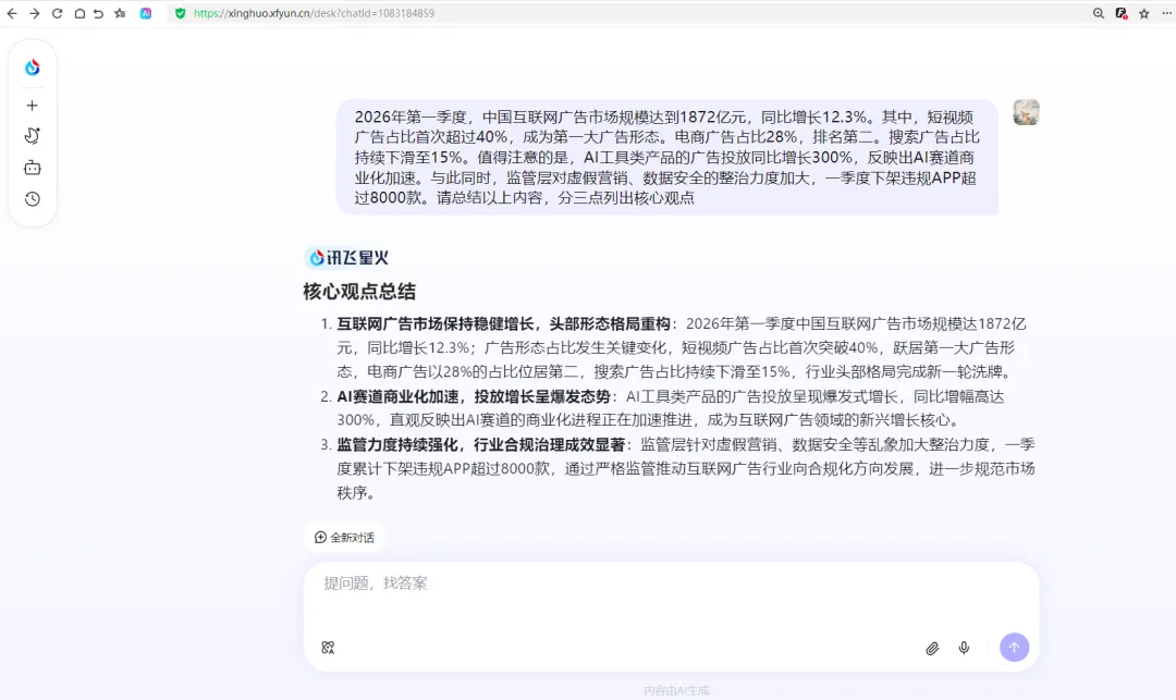 直接复制一段文字给讯飞星火,让它帮你总结。