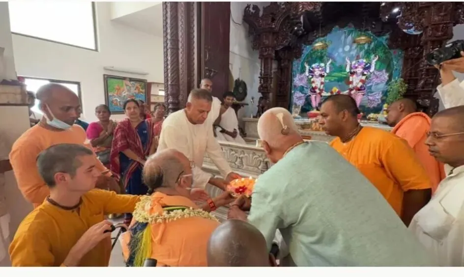在上午11点30分,我前往曼迪尔。我得到了尼太•高冉嘎(Nitāi Gaurāṅga)、茹阿达•奎师那•拉丽塔•维莎卡 (Rādhā Kṛṣṇa Lalitā Viśākhā)、茹克蜜妮•奎师那•萨缇亚芭玛(Rukmiṇī Kṛṣṇa Satyabhāmā)、哥瓦尔丹•希拉(Govardhana-śilā)、佳甘纳特•巴拉戴瓦•苏巴卓•苏达尔善•查夸(Jagannātha Baladeva Subhadrā Sudarśana Cakra),以及拉克施蜜•纳茹阿星哈(Lakṣmī Narasiṁha)的达尔善。我向塔库尔们以及施瑞拉•帕布帕德(Śrīla Prabhupāda)供奉了鲜花和灯。