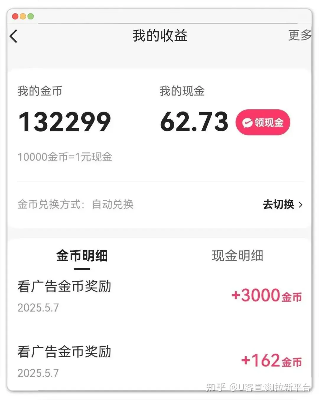 虽然它跟抖音极速版同属一家,但兑换比例更高,33000金币才能换1块钱,而且比例还会浮动,需要留意一下。