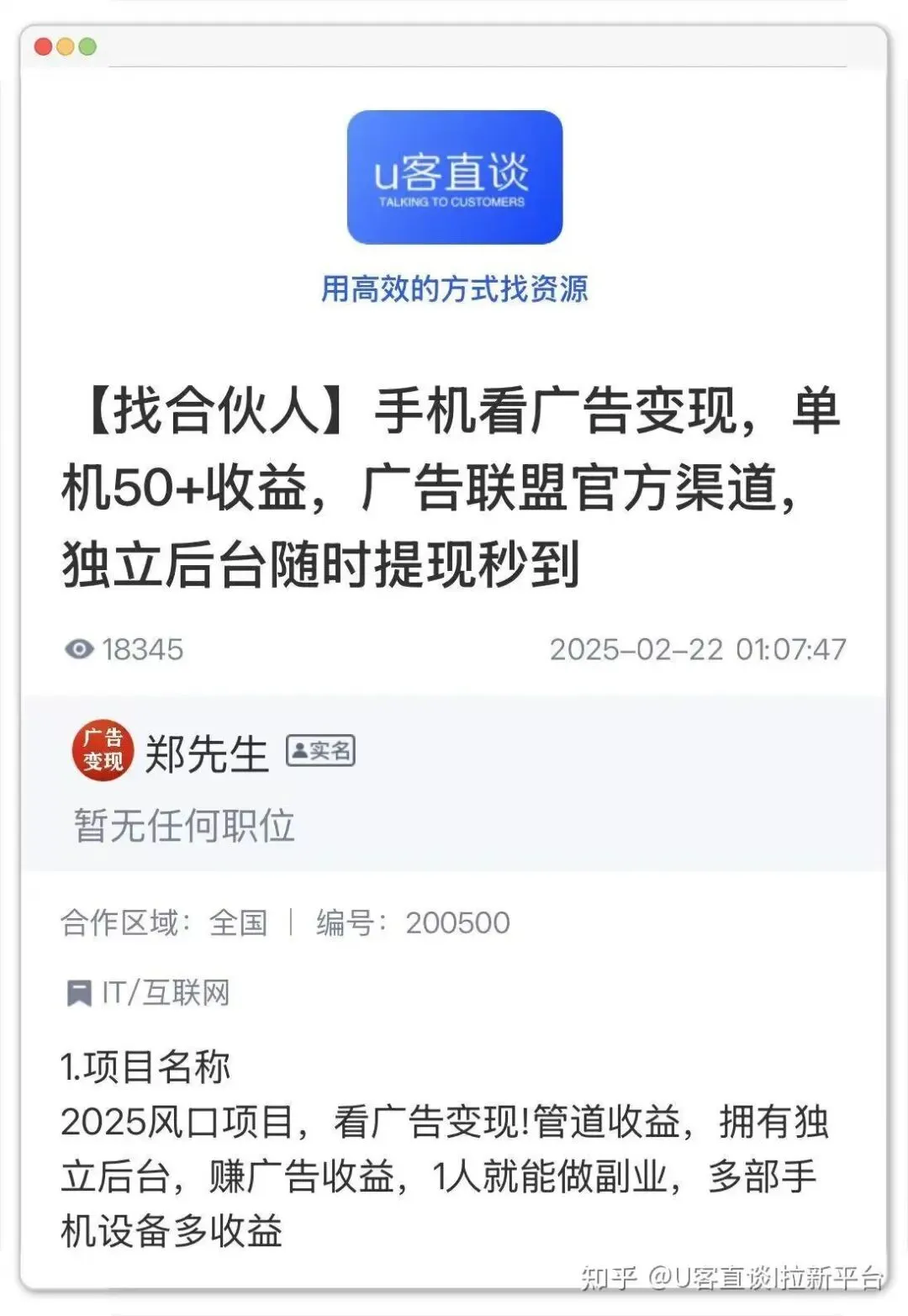 U客直谈跟其他几款看广告挣钱app不太一样,它本身不直接提供看广告的功能。但我还是把它放进来,是因为它上面有很多看广告赚钱的项目。