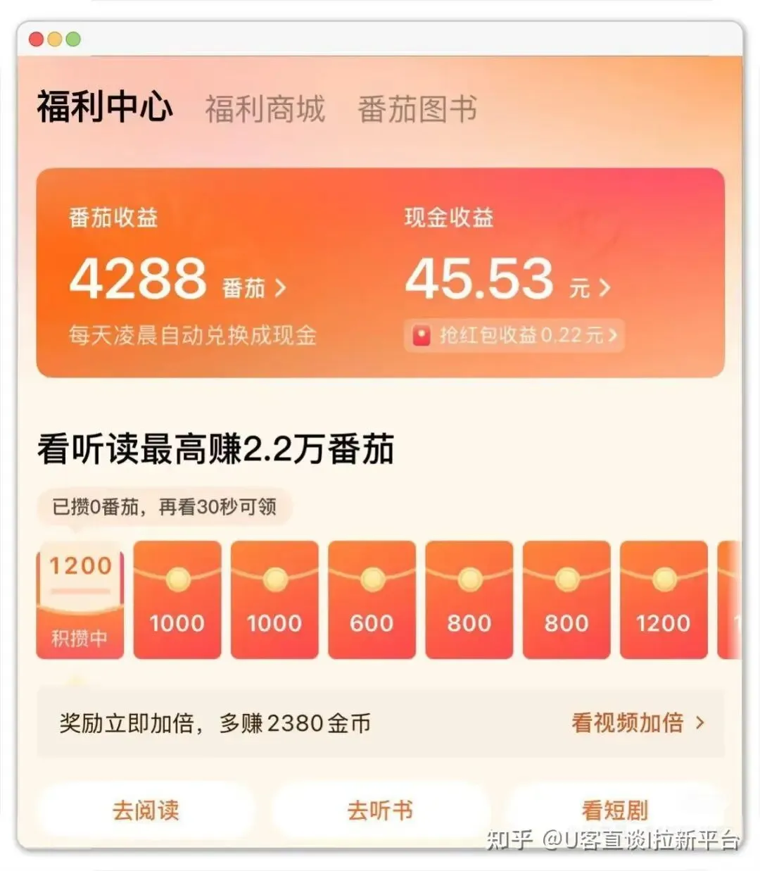 番茄小说和抖音极速版是一家的,它的单个广告收益不算特别高,但胜在可以听书。