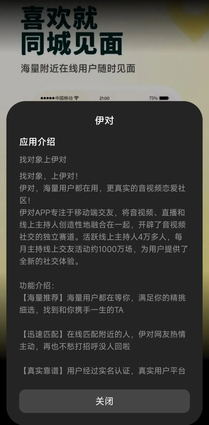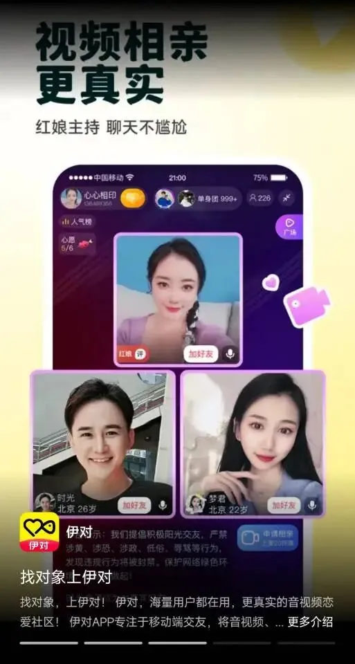 传统婚恋网站(如世纪佳缘)主打严肃匹配,而伊对的成功意味着“轻严肃、重娱乐”的路线被验证。对于单身用户,相亲不再是填资料进行匹配,而是像看直播一样“逛”对象,降低了社交门槛,尤其契合下沉市场需求。
