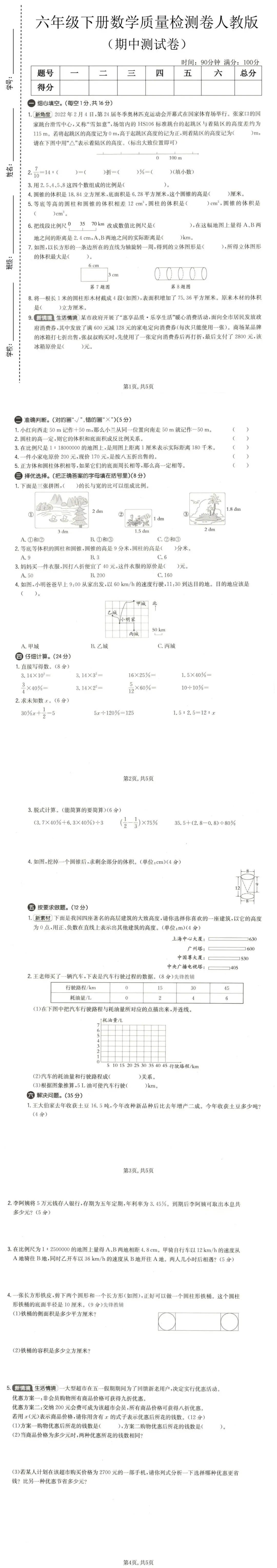🏆本套试卷紧扣人教版六年级下册期中核心内容,全面覆盖负数、百分数(二)、圆柱与圆锥、比例四大核心模块,兼顾基础计算与综合应用,贴合期中阶段学习要求,全面检测学生数学素养。