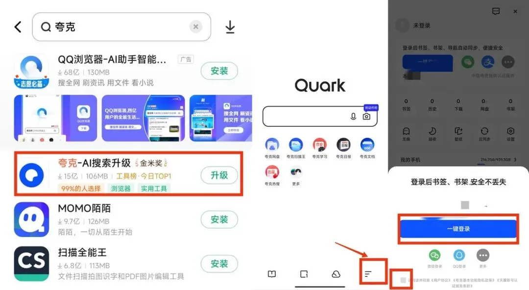在手机的应用商店(或应用商城,或应用市场),搜索:夸克,下载夸克APP。(可参考下面的图片)