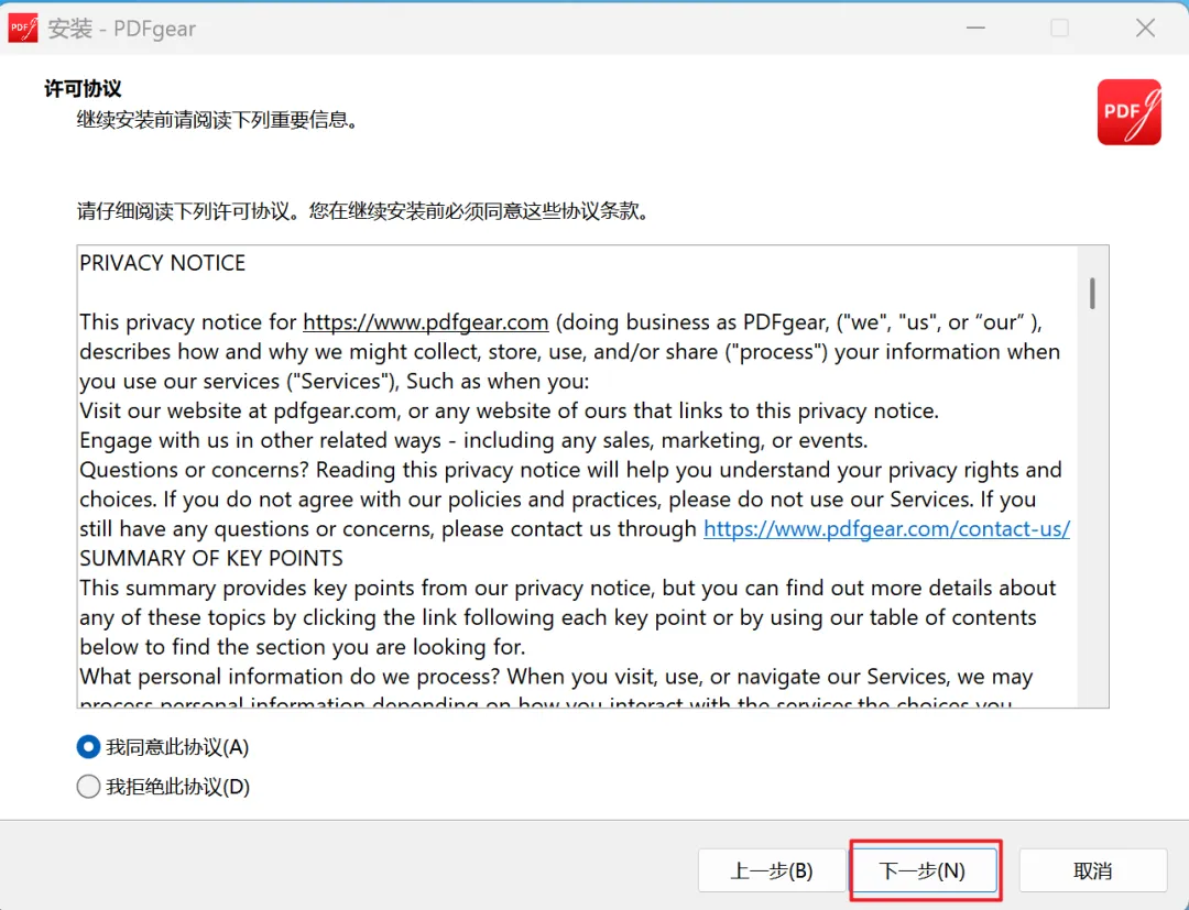 3、显示许可协议页面,默认同意,点击下一步