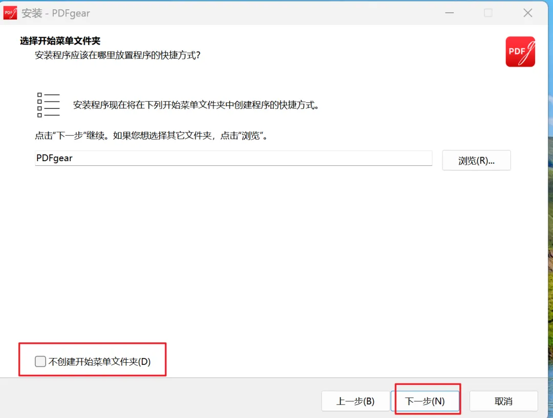 5、若不想创建开始菜单文件夹,则勾选左下角的选择。然后点击下一步;否则可以不做修改,直接点击下一步。