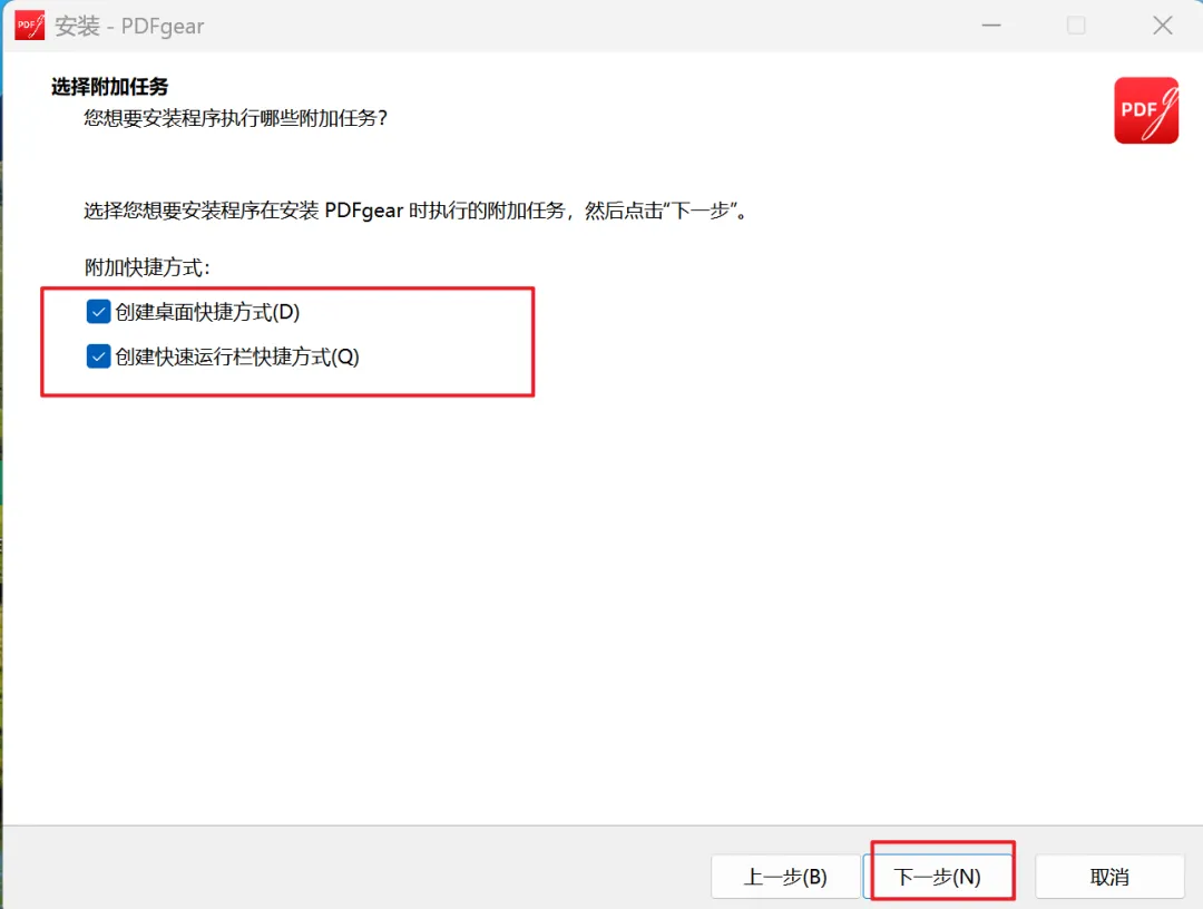 6、附加任务页面,可以取消附加的快捷方式,也可以默认勾选,自动创建桌面快捷方式(方便后续在桌面看到此应用的图标,可以快速点击启动),点击下一步