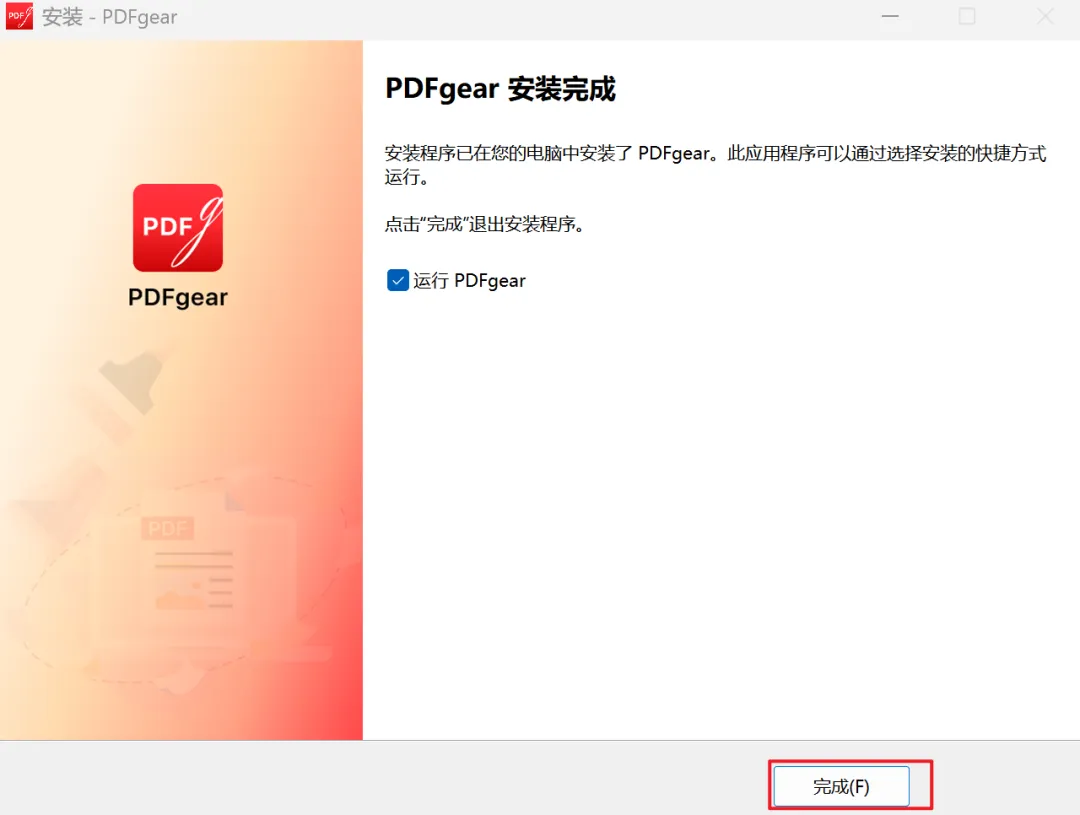 8、待安装完成后,显示完成页面,默认勾选 运行PDFgear 的选项,若不想现在启动此软件,则取消勾选。然后点击完成,即可完成安装。