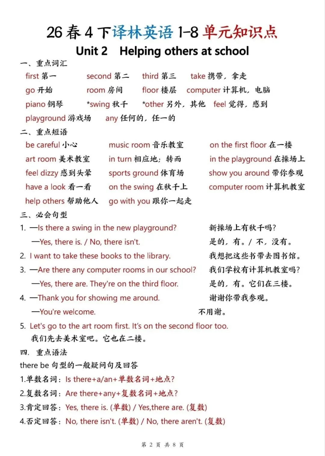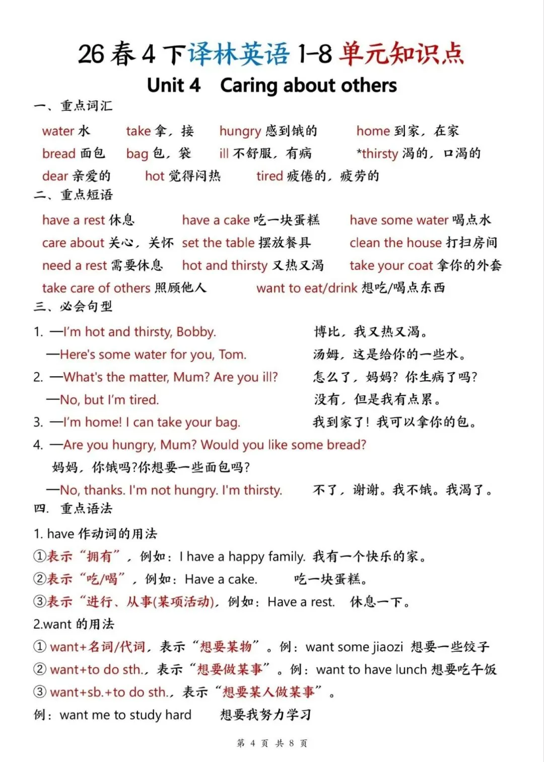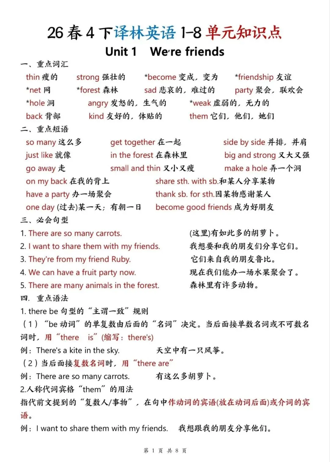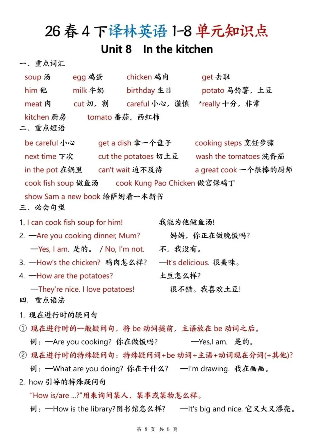 译林版26春四年级下册英语1-8单元知识点,电子版可下载打印