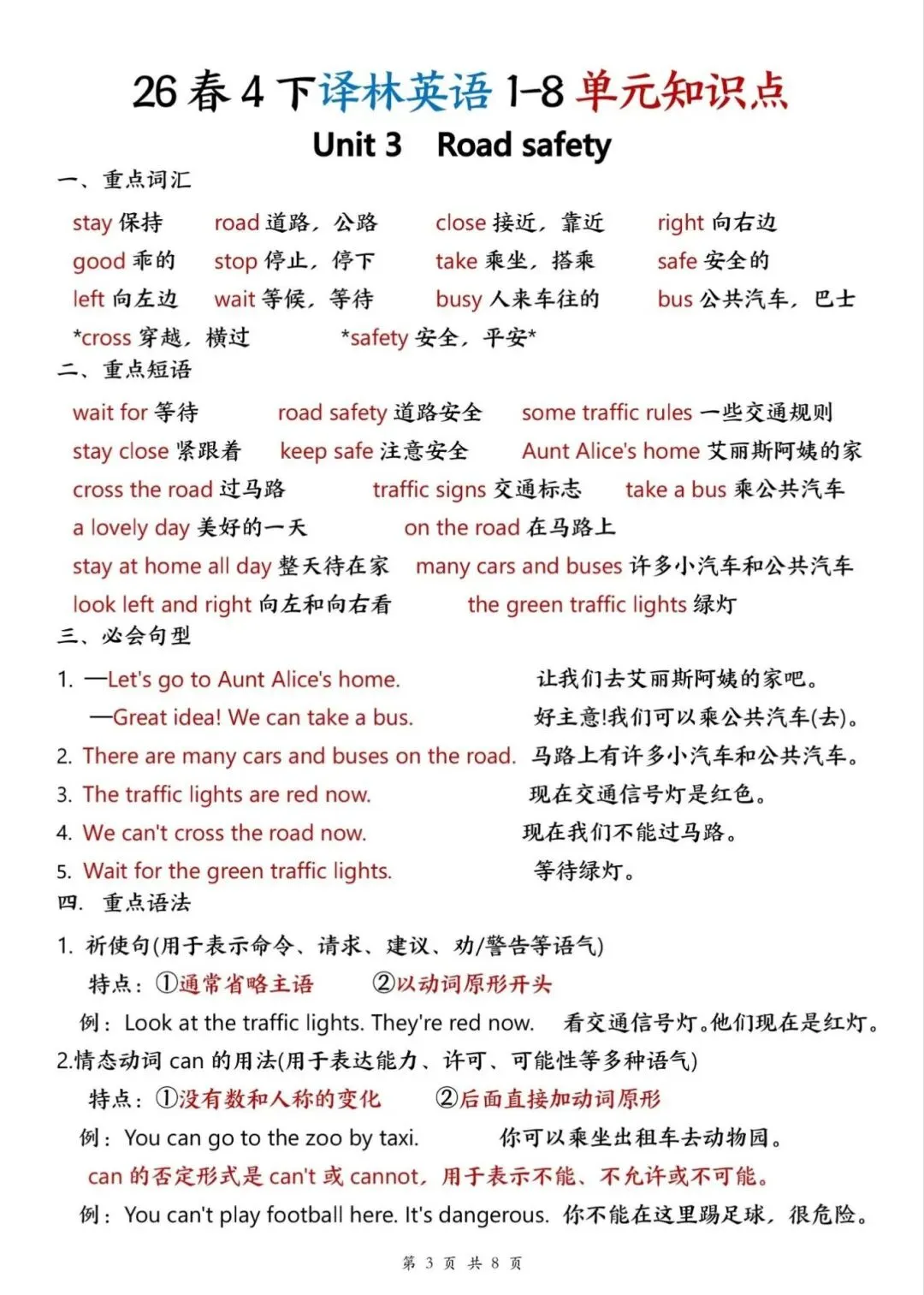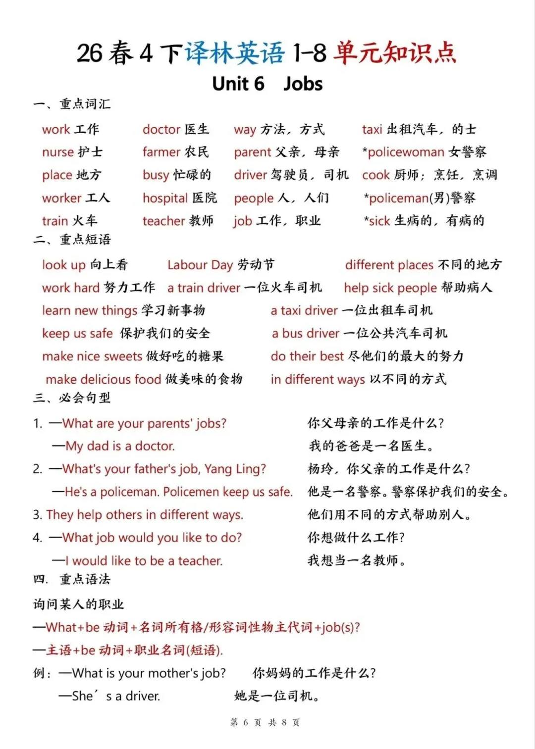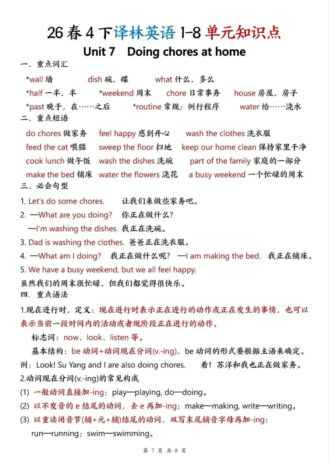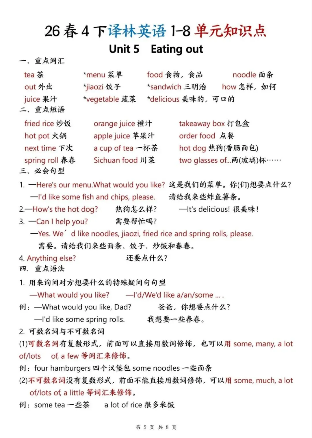 译林版26春四年级下册英语1-8单元知识点,电子版可下载打印