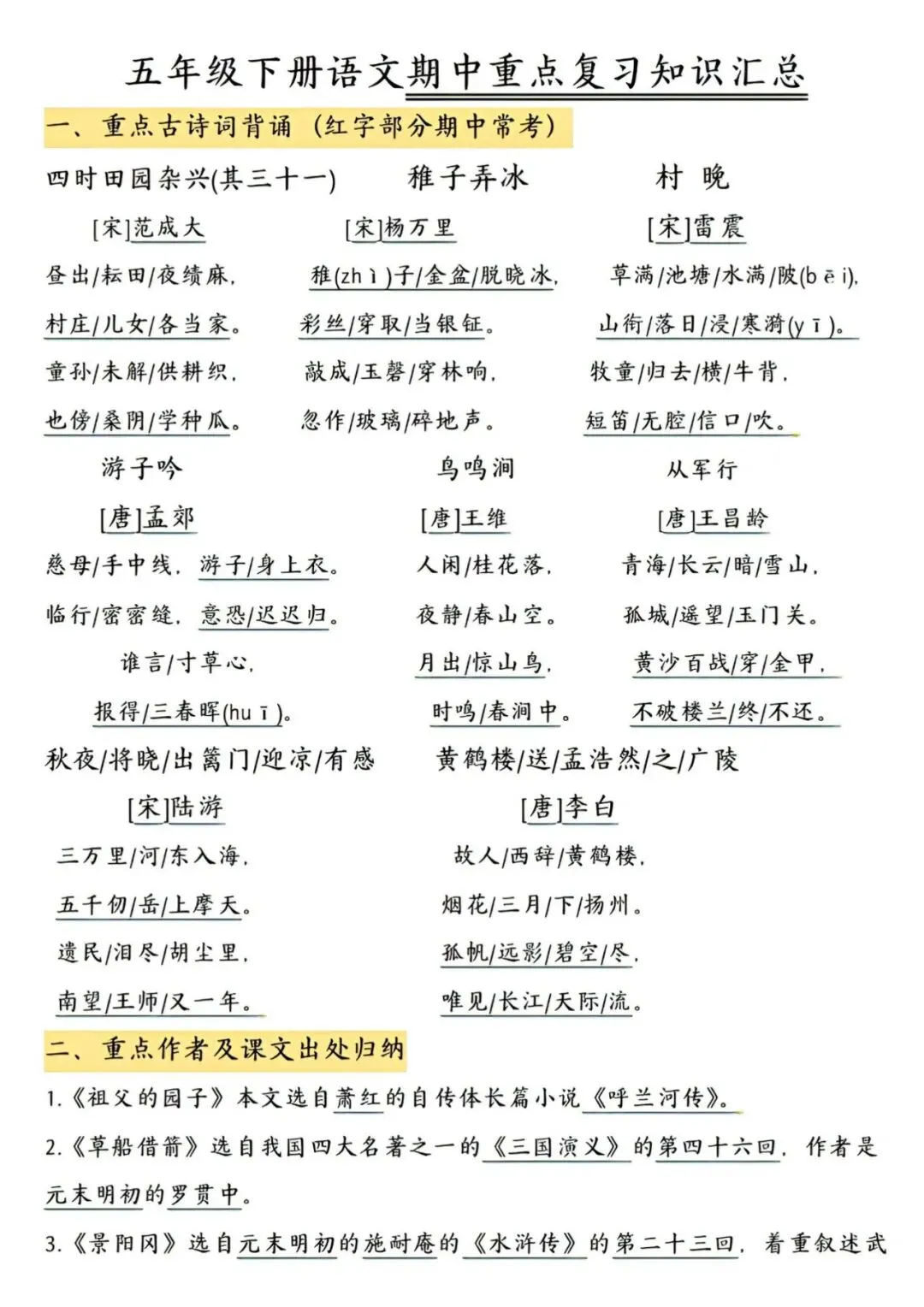 26春五下语文《期中重点复习知识汇总》 可免费下载打印