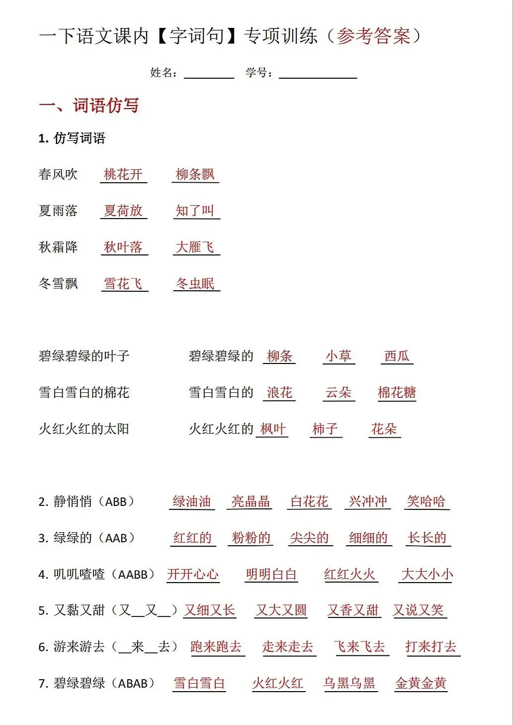 26春部编版一年级下册语文课内考试重点字词句仿写专项训练;可打印