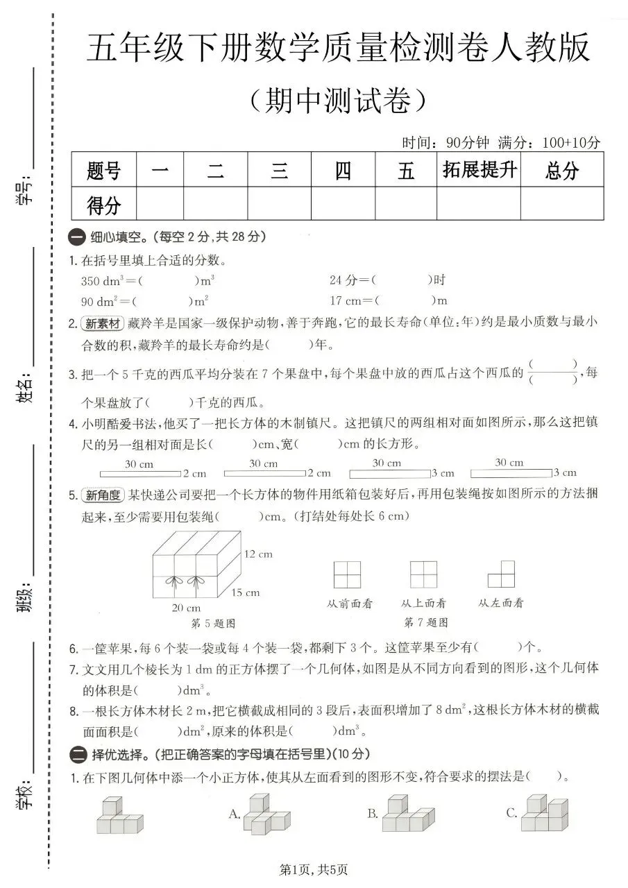 🏅本套试卷紧扣人教版五年级下册期中核心内容,全面覆盖因数与倍数、长方体和正方体、分数的意义与性质、观察物体(三)四大核心模块,兼顾基础与思维拓展,贴合期中阶段学习要求。
