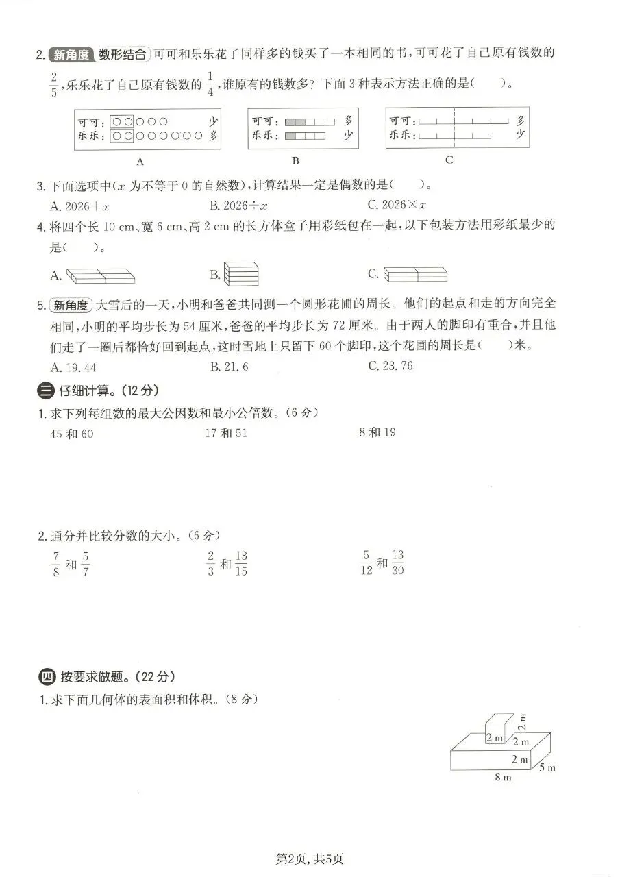 以生活情境为载体,如糖水浓度比较、干支纪年周期、最优包装等,考察学生分析数量关系、解决实际问题的能力,同时融入数学文化、逻辑推理,兼顾不同层次学生的学习水平,全面检测期中阶段的知识掌握与数学素养。