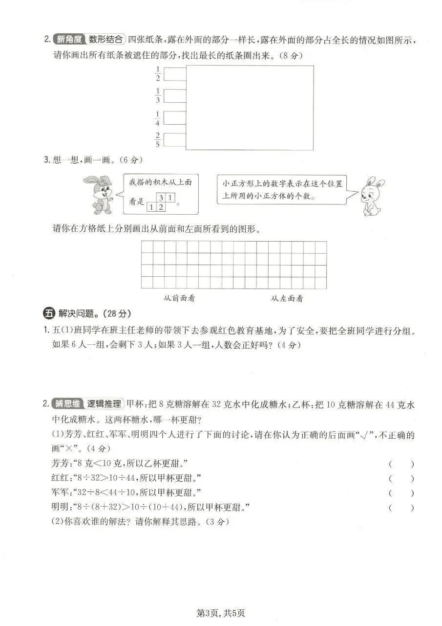 系统考察分数的意义、分数与除法的关系、单位换算、通分、分数大小比较,结合数形结合题型(纸条长度比较),深化对分数概念的理解,为分数运算打基础。