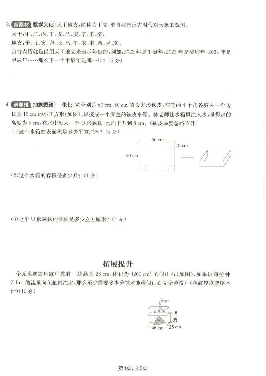 围绕长方体、正方体的棱长、表面积、体积、容积展开,考察单位换算、表面积/体积计算、切割拼接后的表面积变化、不规则物体体积(排水法)等,结合生活实际(如包装绳长度、水箱容积、假山石淹没),强化空间观念与几何应用能力。
