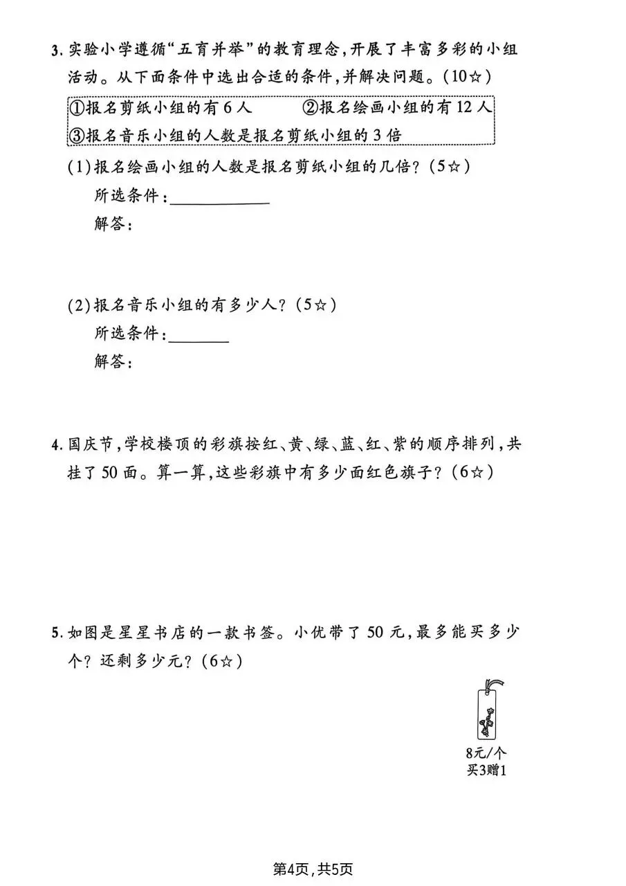 设置开放性、拔高性题目(如调整数量使倍数成立、周期计数、买赠最优方案),考察学生逻辑推理、逆向思维与综合分析能力,兼顾不同层次学生的学习水平,全面检测期中阶段的知识掌握与数学素养。
