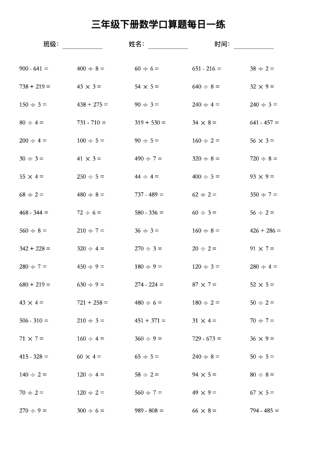 三年级下册数学口算题天天练60页可打印电子版带答案