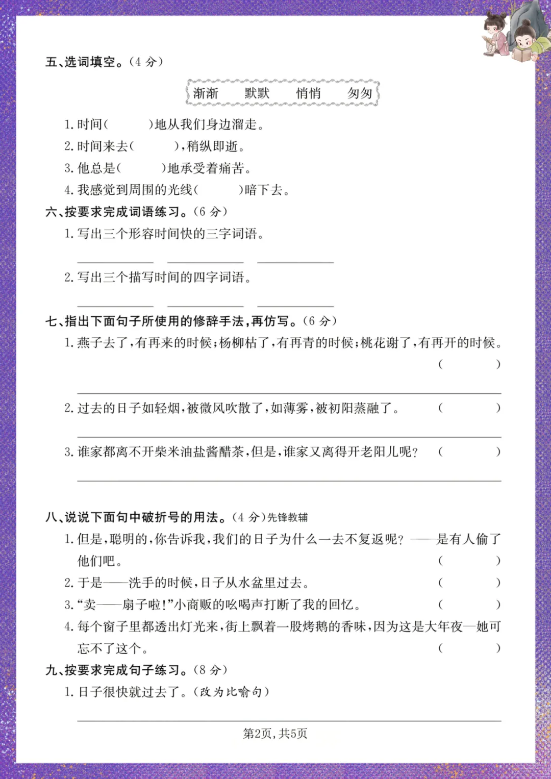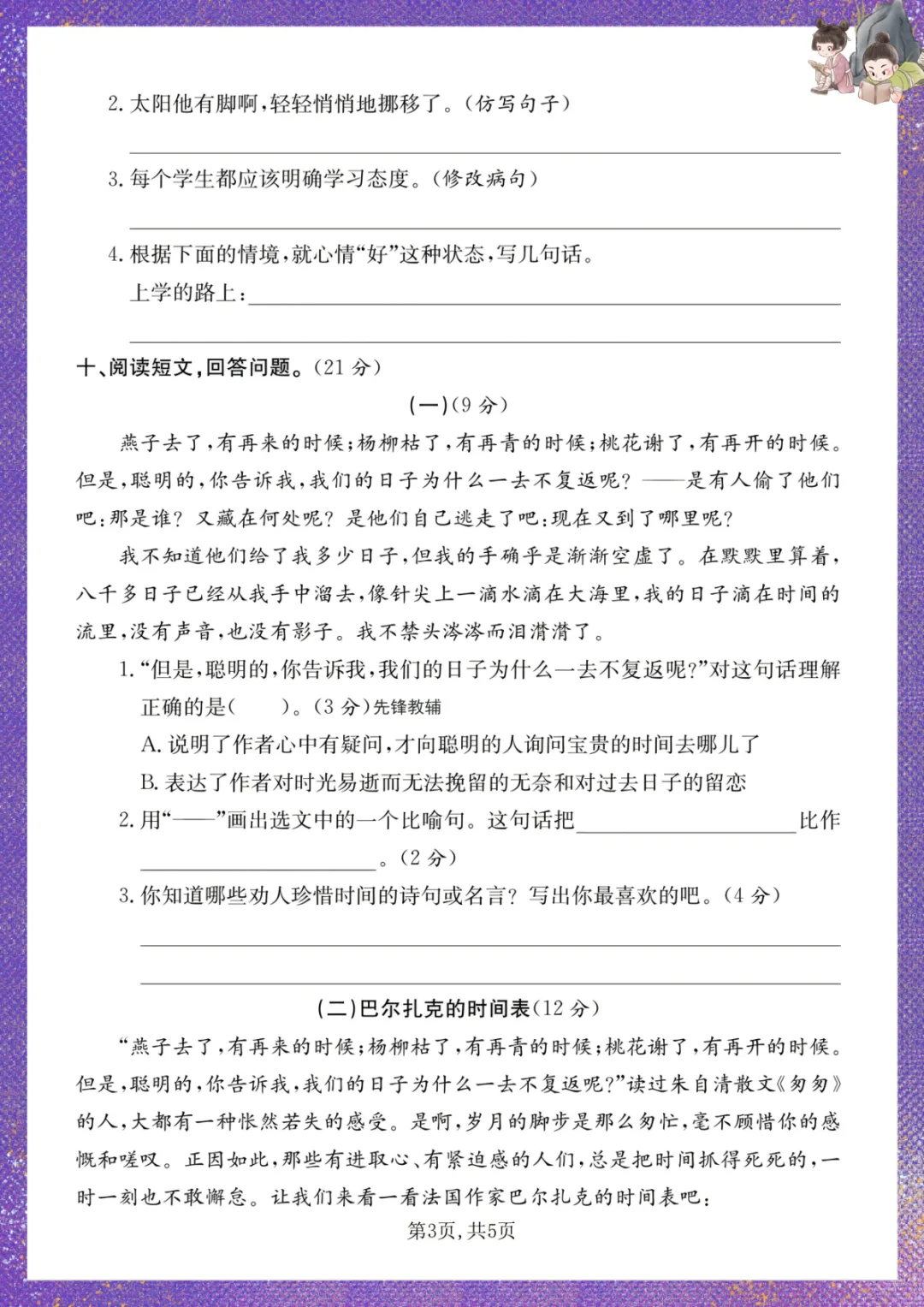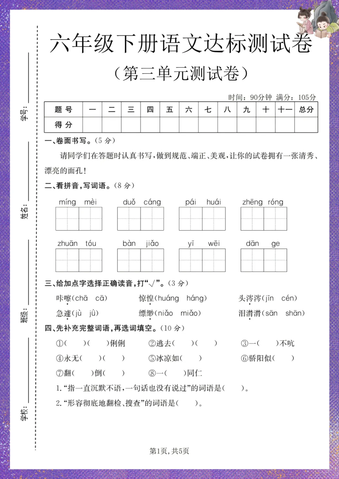 六年级下册语文:第三单元达标测试卷 电子版可下载打印