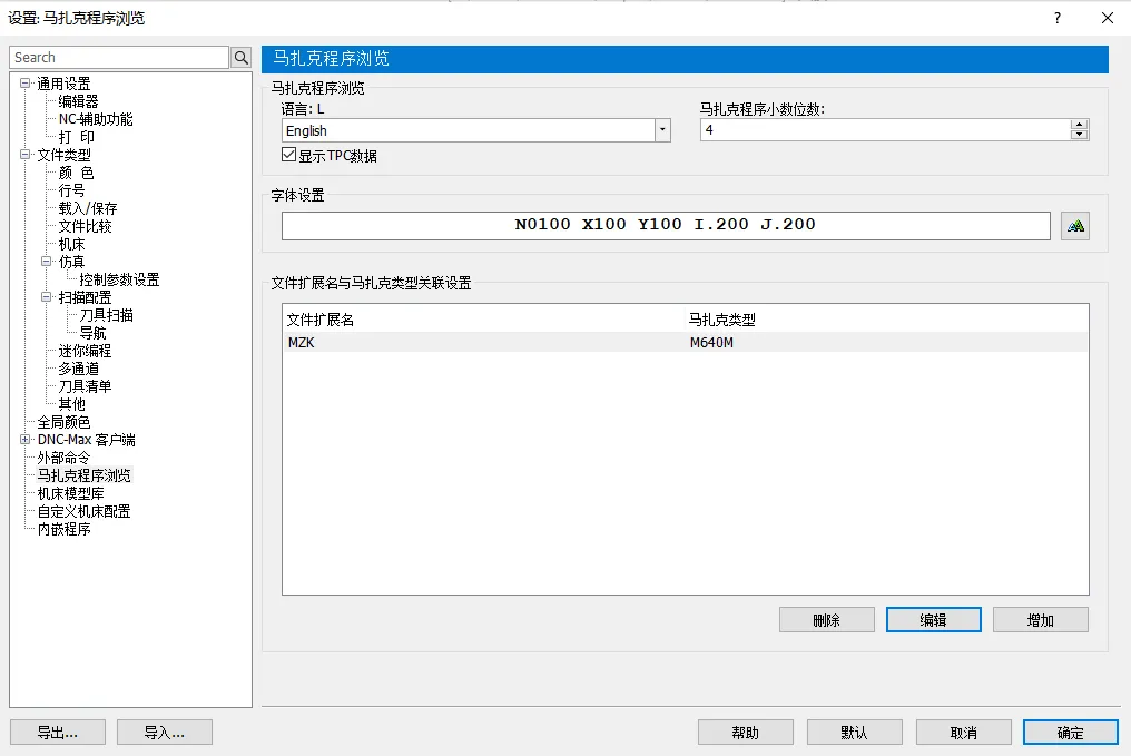 用于将特定文件扩展名与马扎克数控系统进行关联。使用删除、编辑、添加按钮管理列表中的关联项。