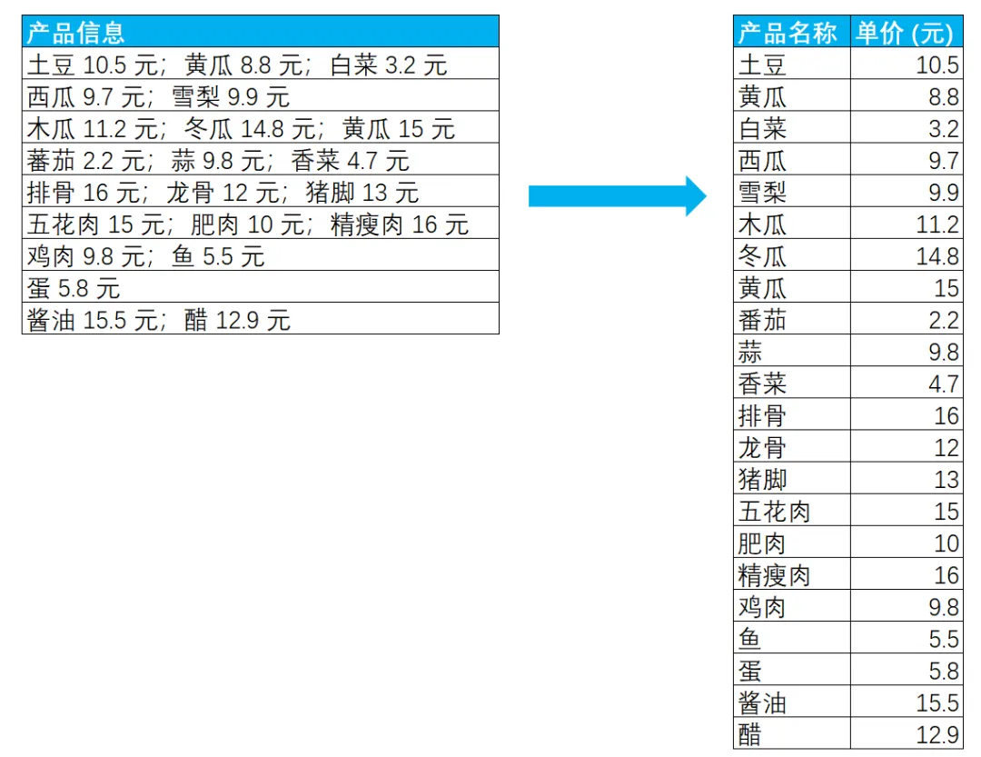 2)拆分后的结果如下图所示。这步只是实现了一个单元格里只存在同一个产品名称和价格。