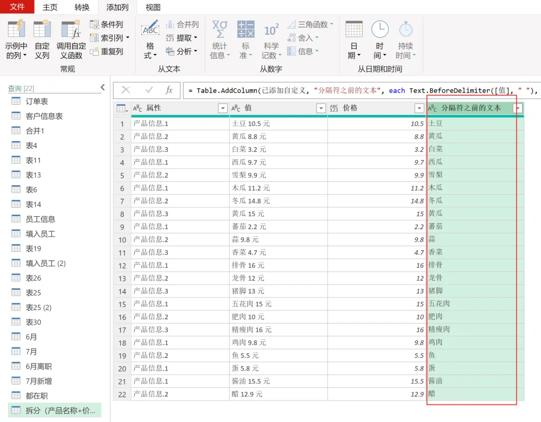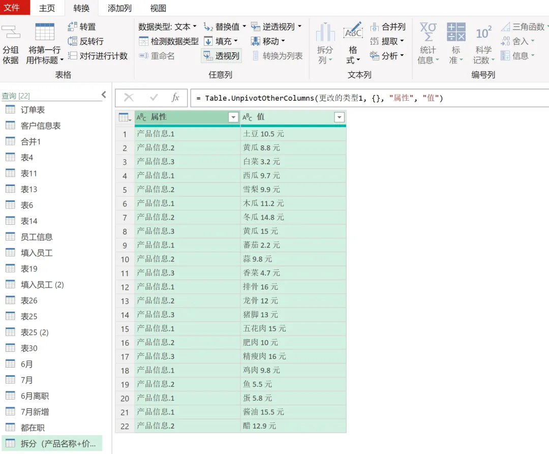 3)下面进行产品和单价的拆分。这步要用到逆透视列这个功能。