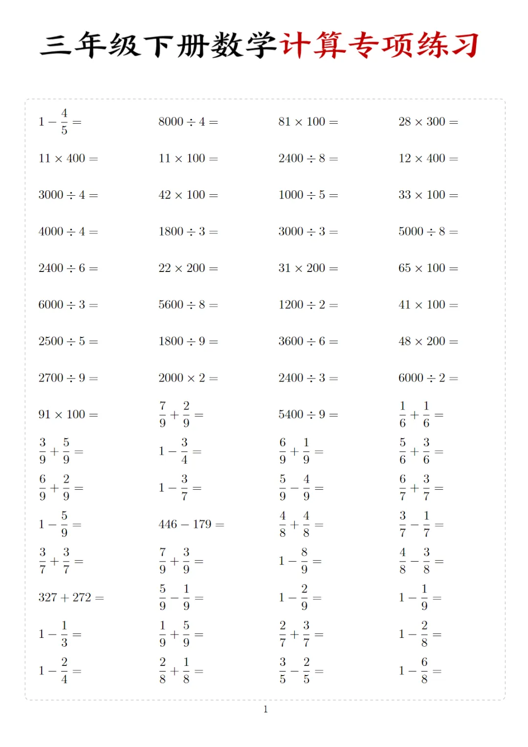 【免费下载】三年级(下)数学 计算专项练习,PDF电子版,共110页,先保存,以免资源失效