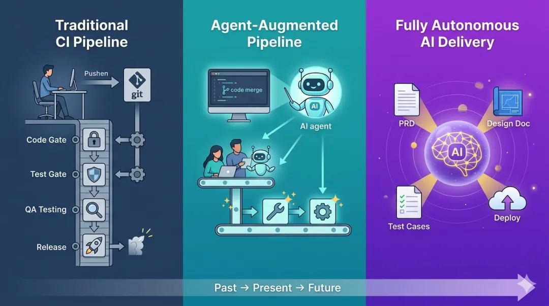 过去我们交付软件依赖 CI流水线基建:开发用git提交代码 → 触发CI流水线 → 编译打包 → 代码门禁(单测、SA等) → 测试门禁(提测准入任务,一般是跑自动化,校验准入Case是否签章等) → 部署测试环境 → QA测试 → 上线发布。
