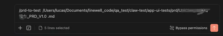 在Claude Code命令行窗口,执行/prd-to-test 需求文档本地路径就可以开始生成APP自动化测试用例