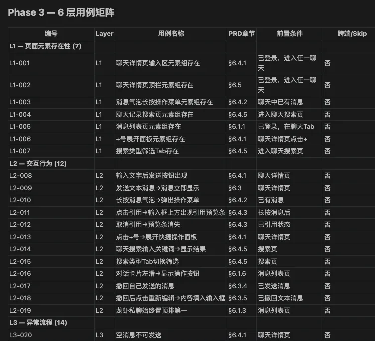 执行到用例设计环节,Skill里面描述了软件测试用例设计规范,按照6层纬度去生成测试用例