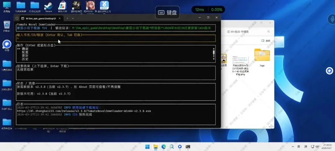 2.在 【 输入书名/ID/链接(Enter 确认,Tab 切换)】 这一行输入你想要下载的小说名字、ID、或者链接,然后点击回车即可,这里我随便找了一本小说来给你们示范一下。(这里需要注意的是,在黄色的框里直接输入就行了)