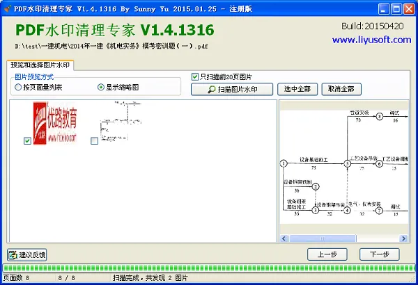 PDF水印清理专家可分步清除PDF里的LOGO、广告链接、QQ号等水印,先选择并预览文件,再通过多种方式分别扫描、移除文字水印与图片水印,最后保存清理后的文件。