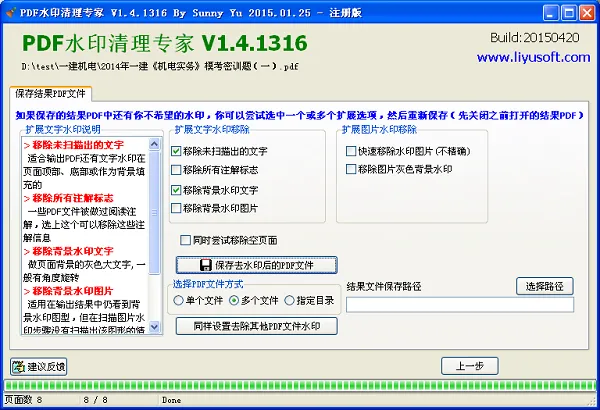 若效果不理想可调整保存选项优化,还能复用设置批量处理单个、多个或整目录的PDF文件,批量去除同款水印,既得到干净文档又节省打印墨水。
