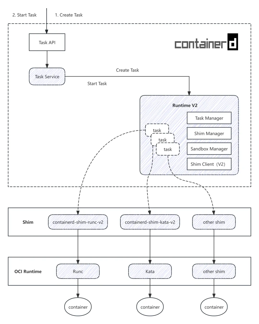 Containerd 中,Task 是容器进程的动态表达,创建容器其实就是创建并启动 Task,总体流程如下所示: