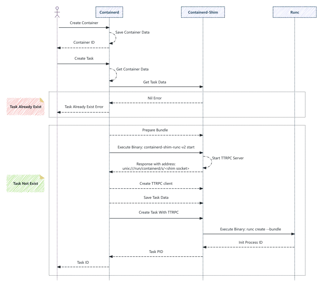 从实现意图看,创建 Task 这一步解决的是“把运行环境准备好并交给正确的 runtime/shim 托管”,而不是“立即执行用户进程”。这也是后续 Start 阶段能够做到职责单一、路径清晰的前提。