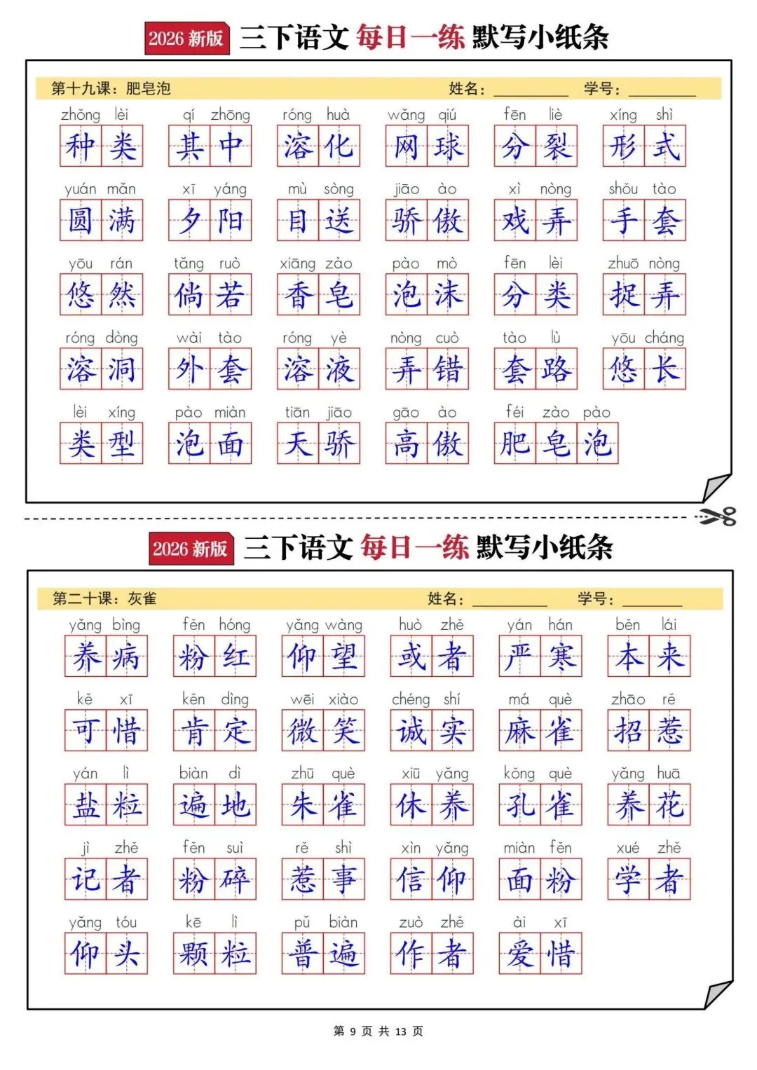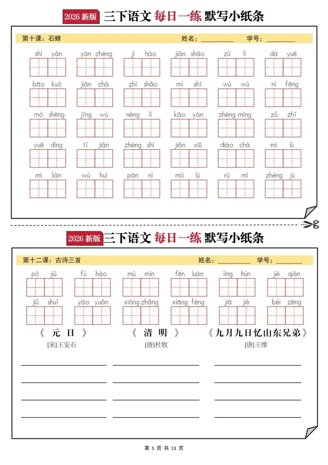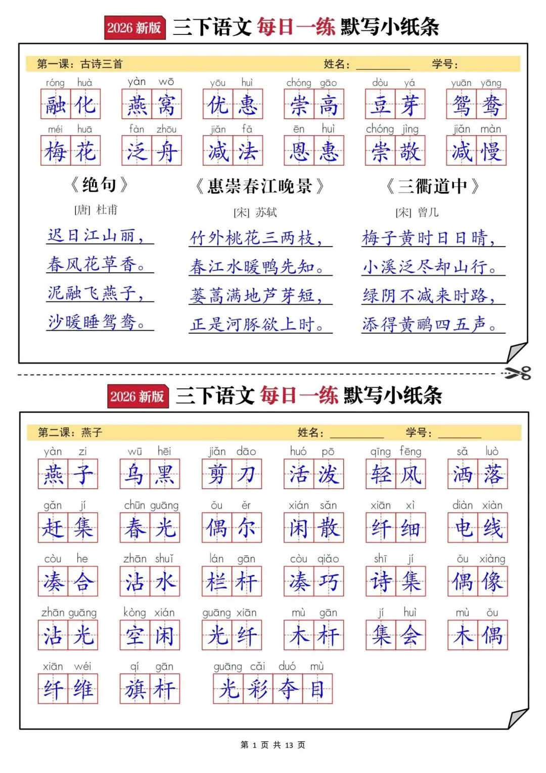 【三年级下册语文每日一练默写小纸条】PDF电子版