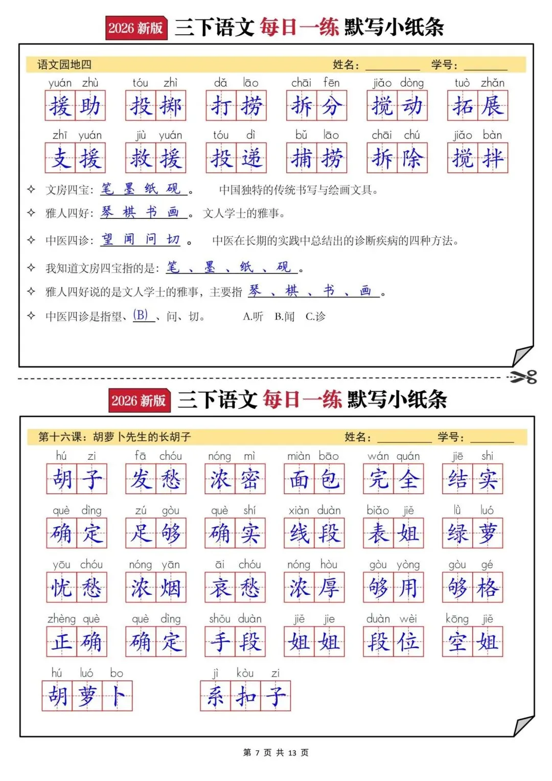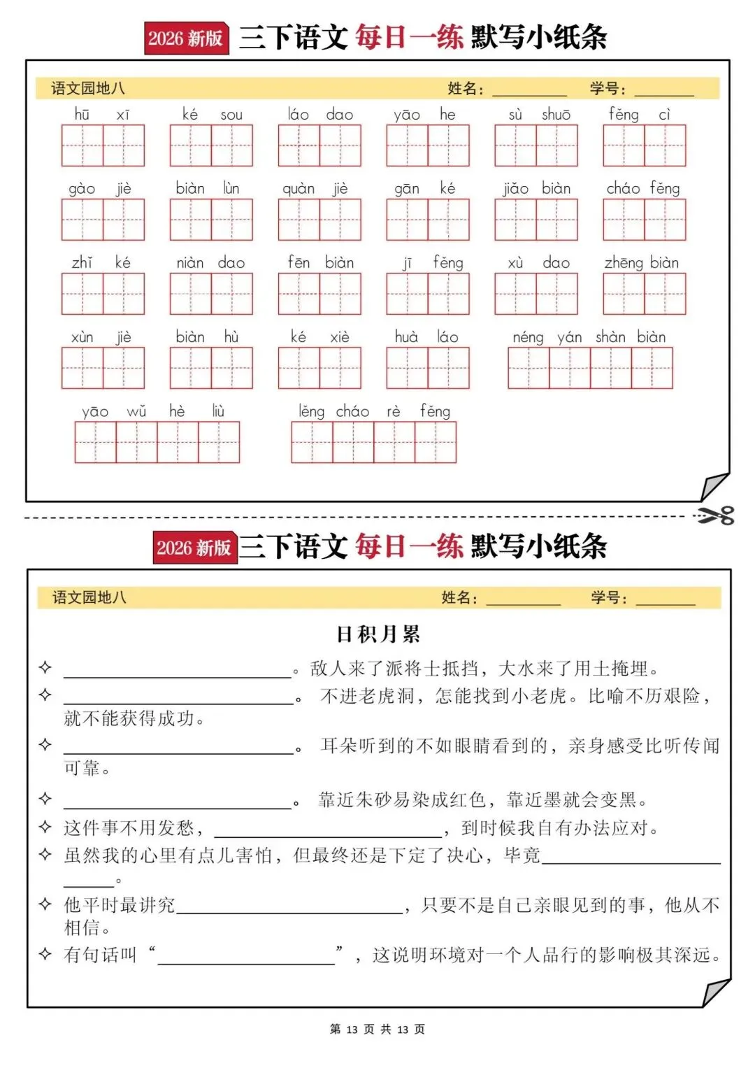 【三年级下册语文每日一练默写小纸条】PDF电子版,内容全,有答案,适合三年级语文复习巩固,包含看拼音写词语、古诗、课文填空、日积月累等,题型丰富,题量充足,家长辅导、孩子练习都很方便~