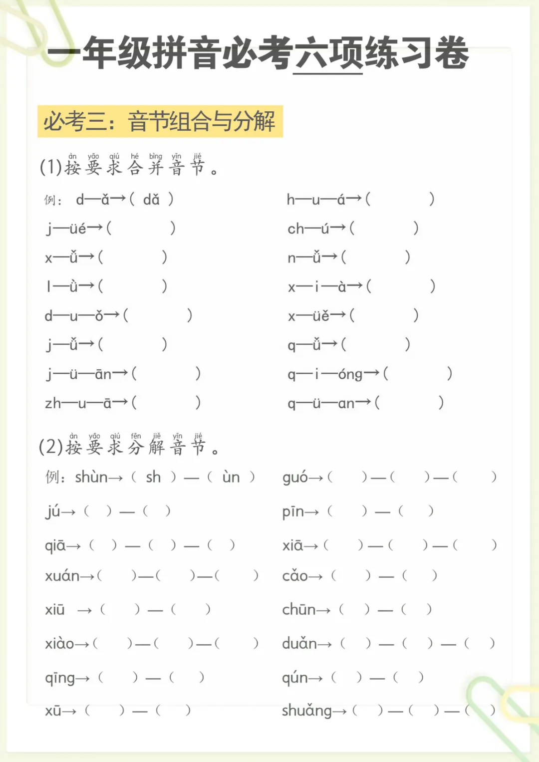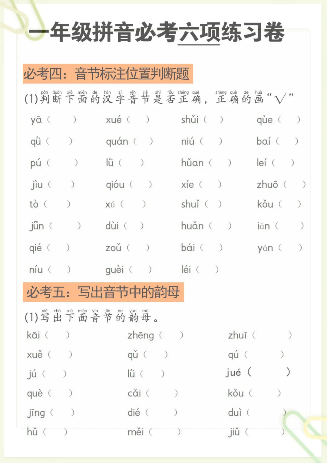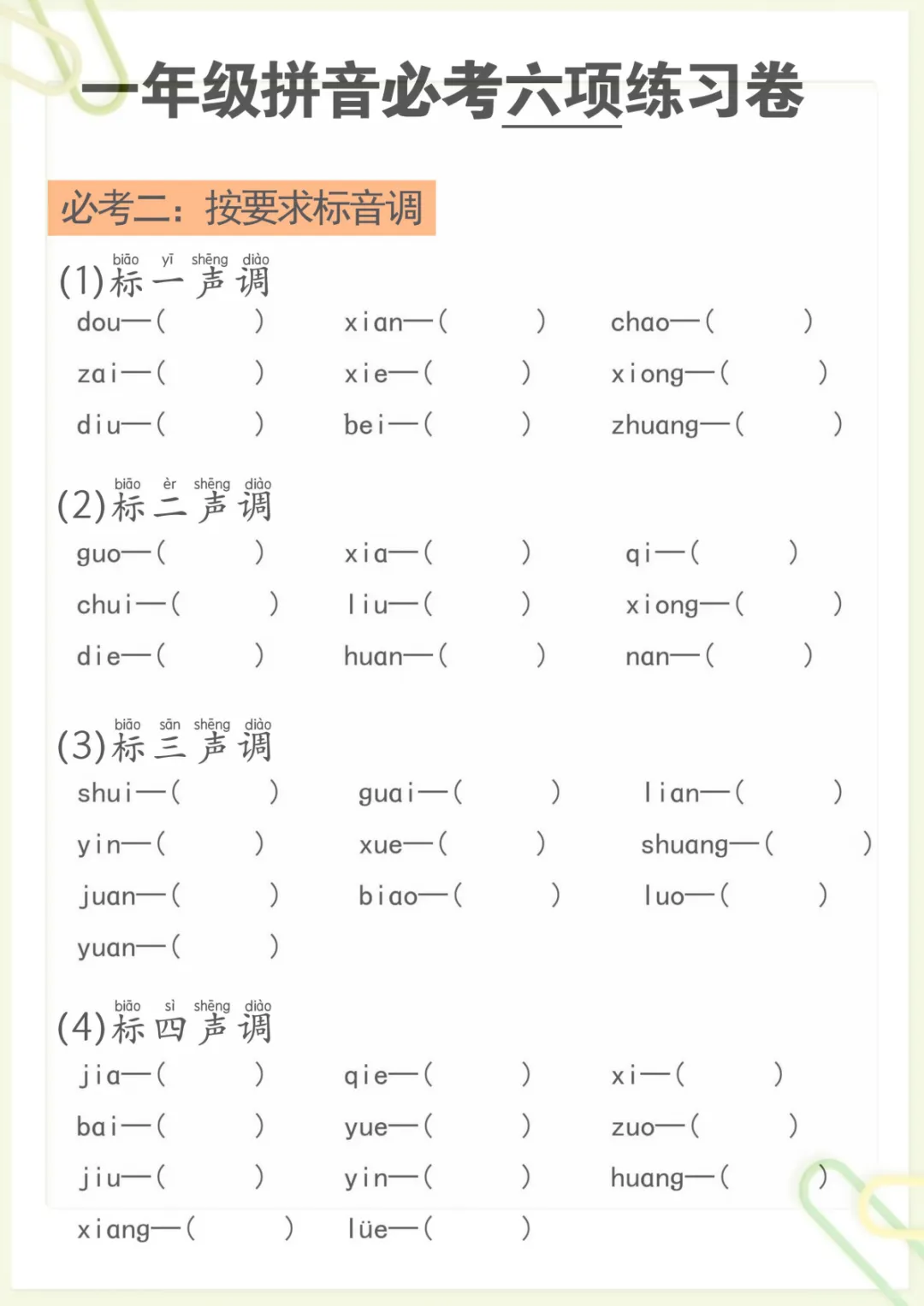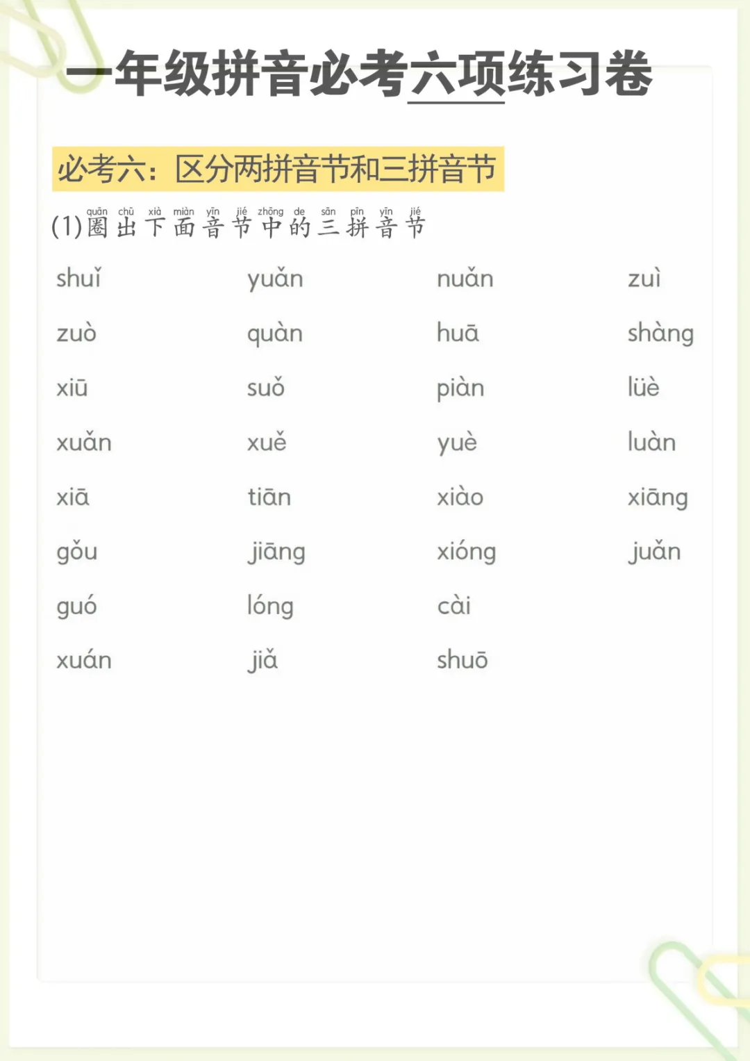 拼音必考六项,共6页,电子版可下载可打印,资料内容紧扣幼小衔接阶段的拼音学习需求,围绕孩子常见的必考重点进行整理,涵盖多个核心知识点与专项训练内容,帮助孩子在练习中进一步巩固基础、查漏补缺,为后续语文学习打好基础。需要的家长可以赶紧下载打印出来,让孩子及时练一练。