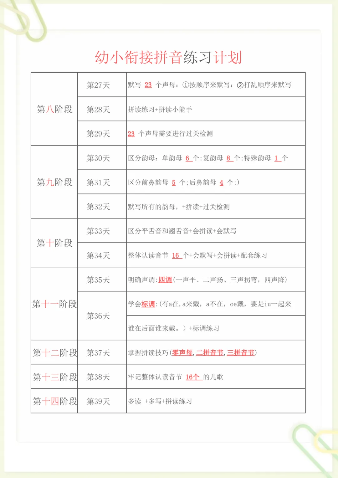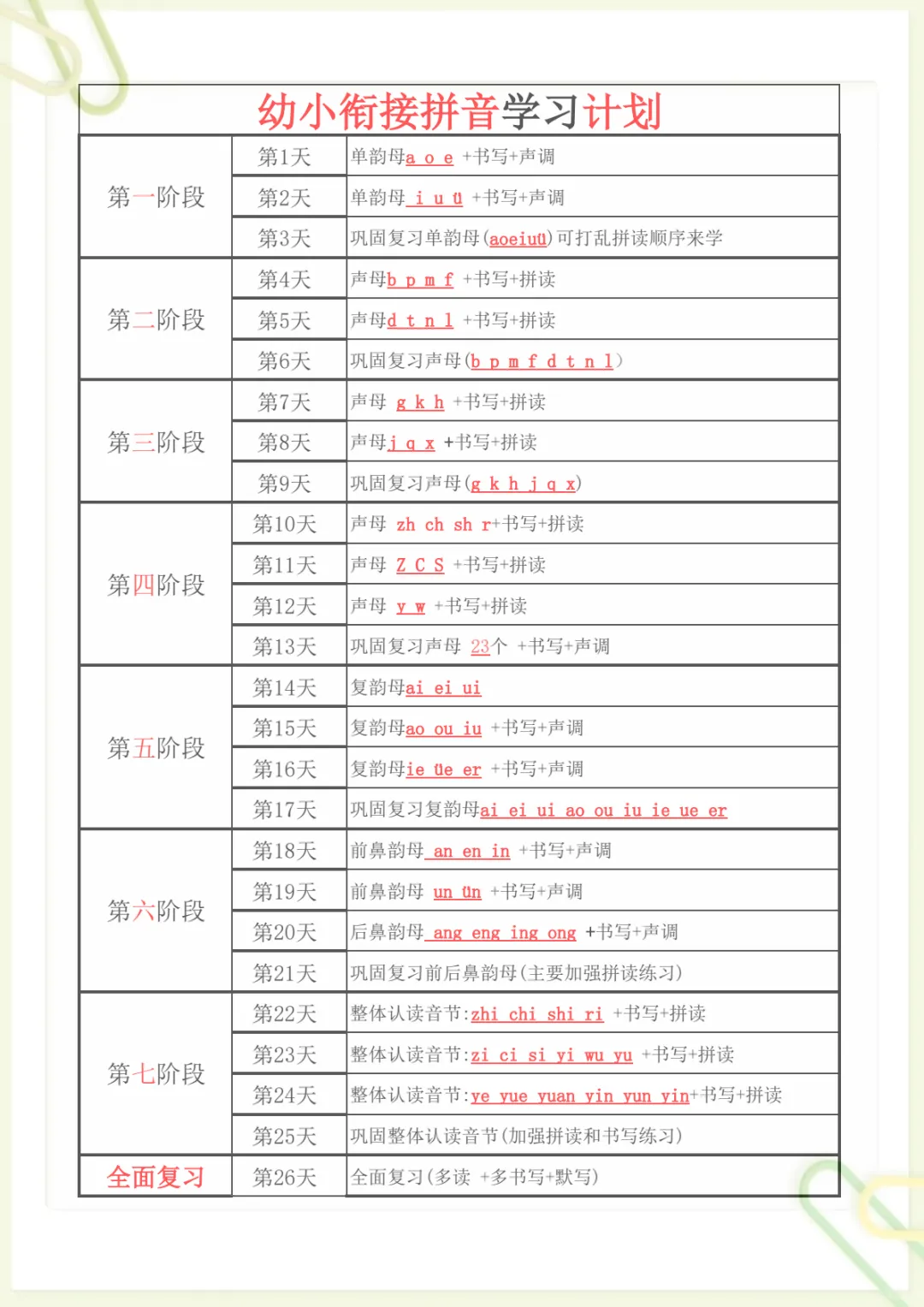 拼音计划,共3页,电子版可下载可打印,适合幼小衔接阶段孩子在入学前进行拼音启蒙与基础巩固,这份资料围绕拼音学习主题整理,涵盖多个核心知识点与专项训练内容,帮助孩子逐步建立拼音认知,打好语文学习基础。需要的家长可以及时下载打印出来,让孩子在家练一练,更轻松做好入学准备。