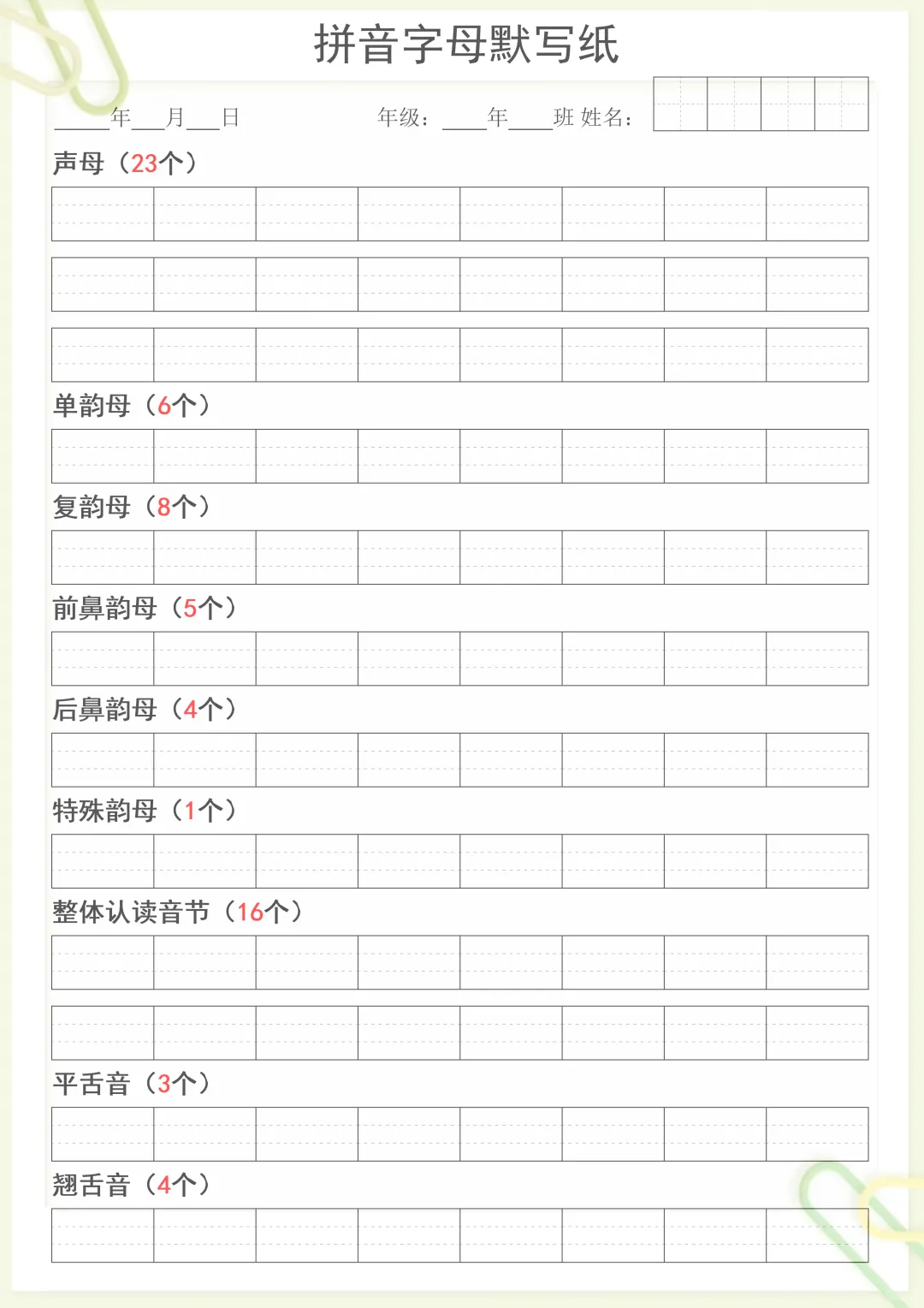 拼音默写,共1页,电子版可下载可打印,这份幼小衔接专项练习资料围绕拼音默写训练设计,涵盖多个核心知识点与专项训练内容,适合家长在孩子入学前或日常巩固时使用,帮助孩子进一步熟悉拼音、强化书写与记忆能力。内容简洁清晰,打印出来就能直接练习,需要的家长可以提前备好,让孩子及时练一练。