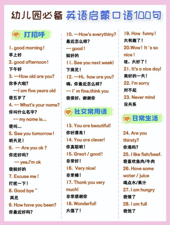幼小衔接 必备《英语启蒙口语100句》电子版,高清彩色可免费打印下载