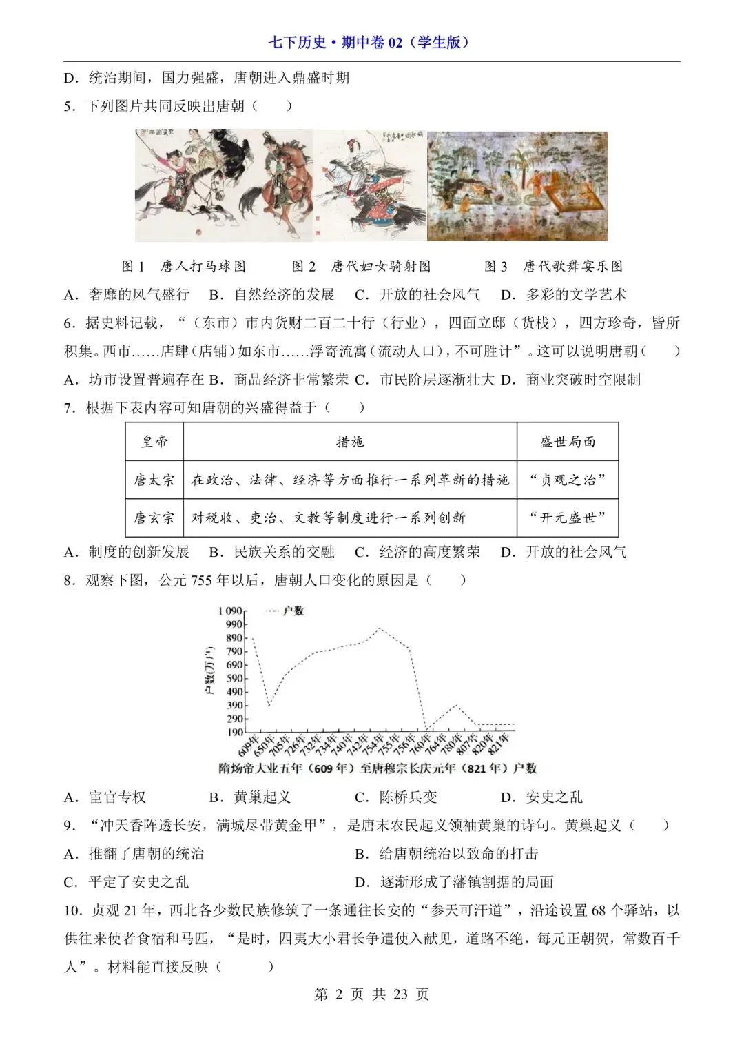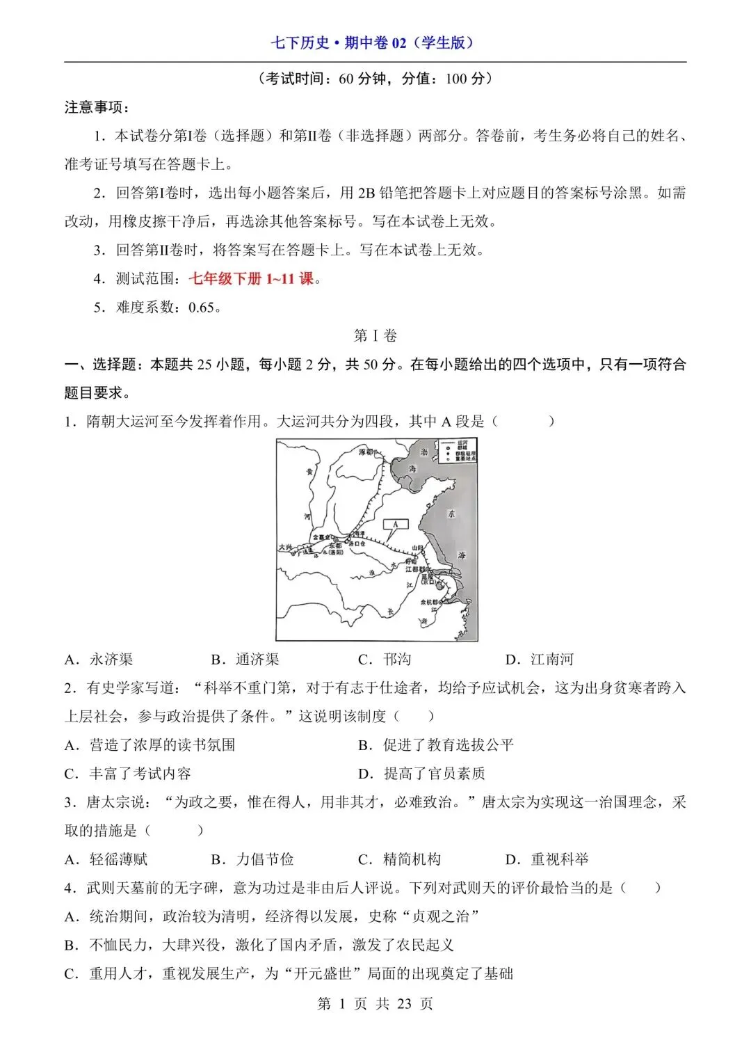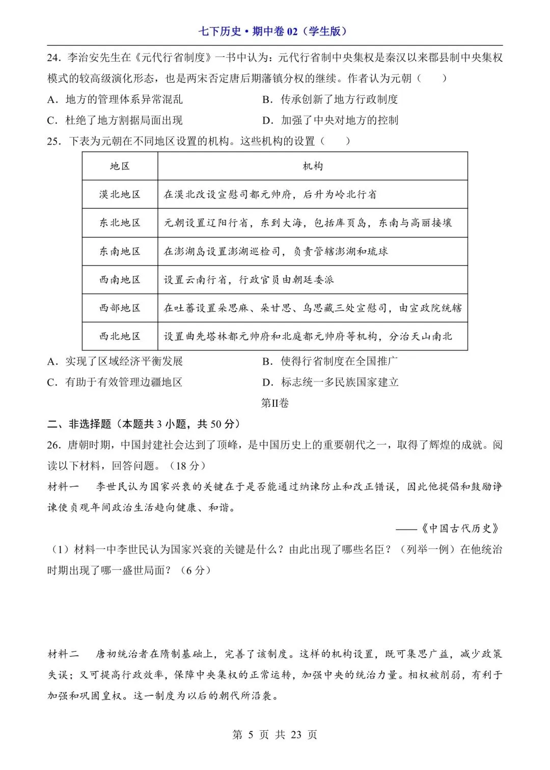 新版初一七年级下册历史期中测试卷含答案可打印