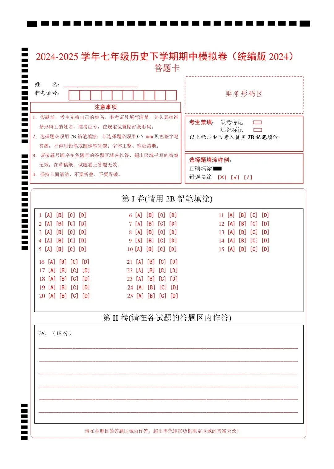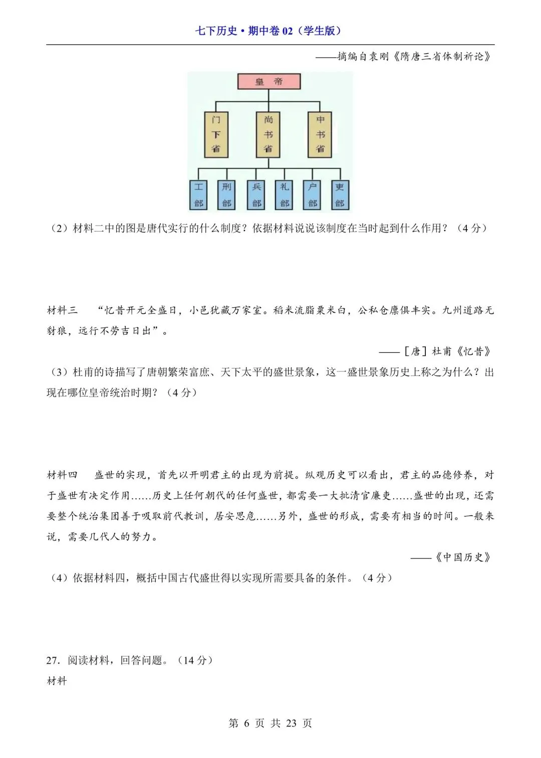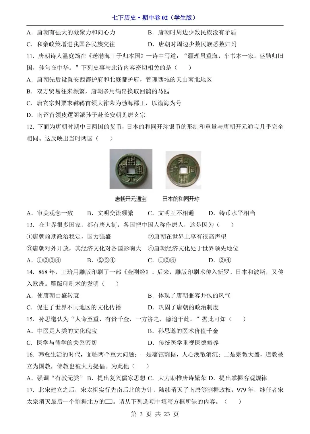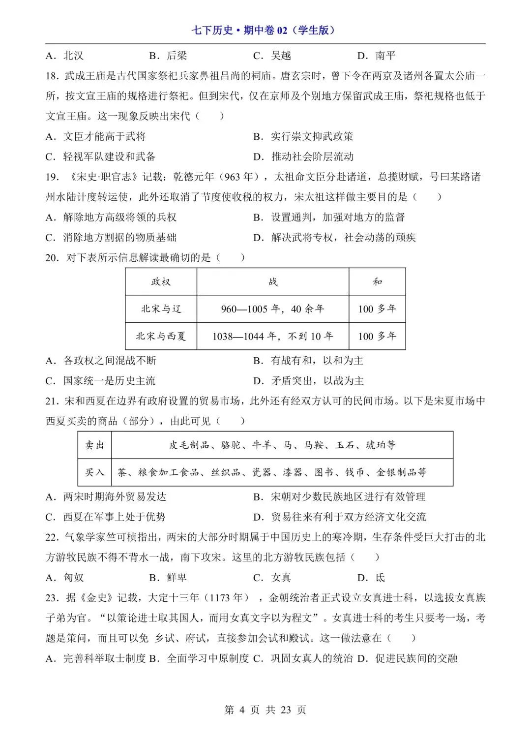 新版初一七年级下册历史期中测试卷含答案可打印