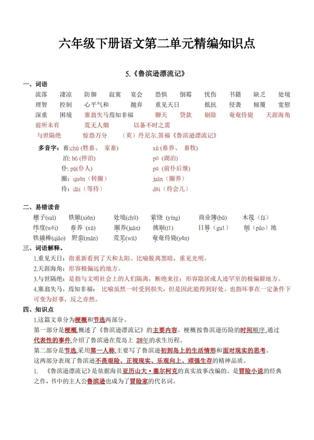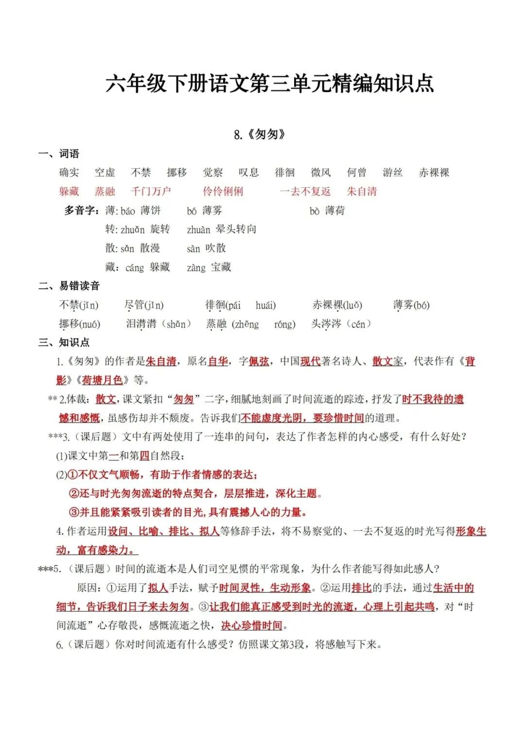 26春六下语文1-6单元精编知识点(详细版),包含词语、多音字、易错读音、四字词语释义,常考句子,课后习题,拓展知识点,可打印
