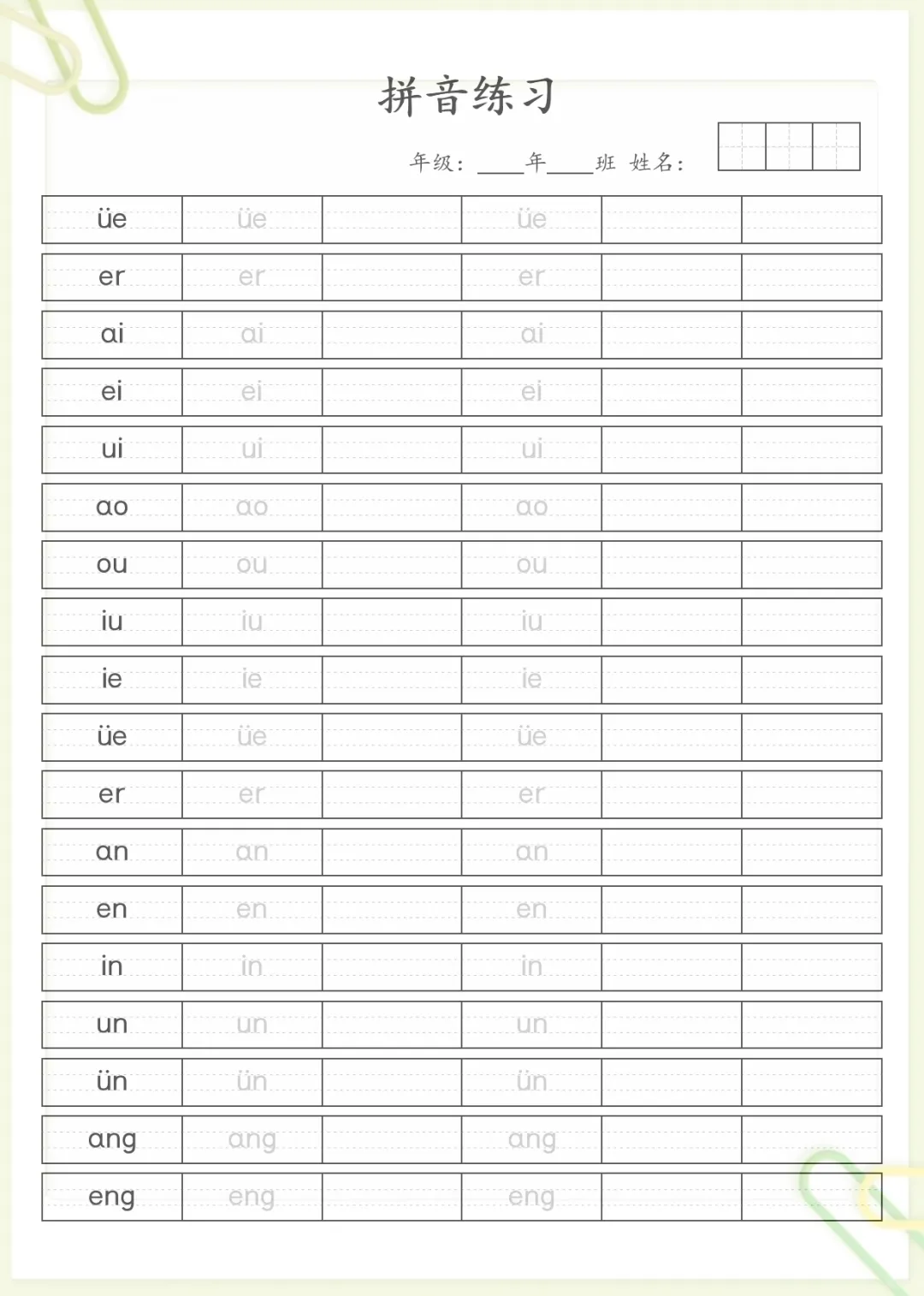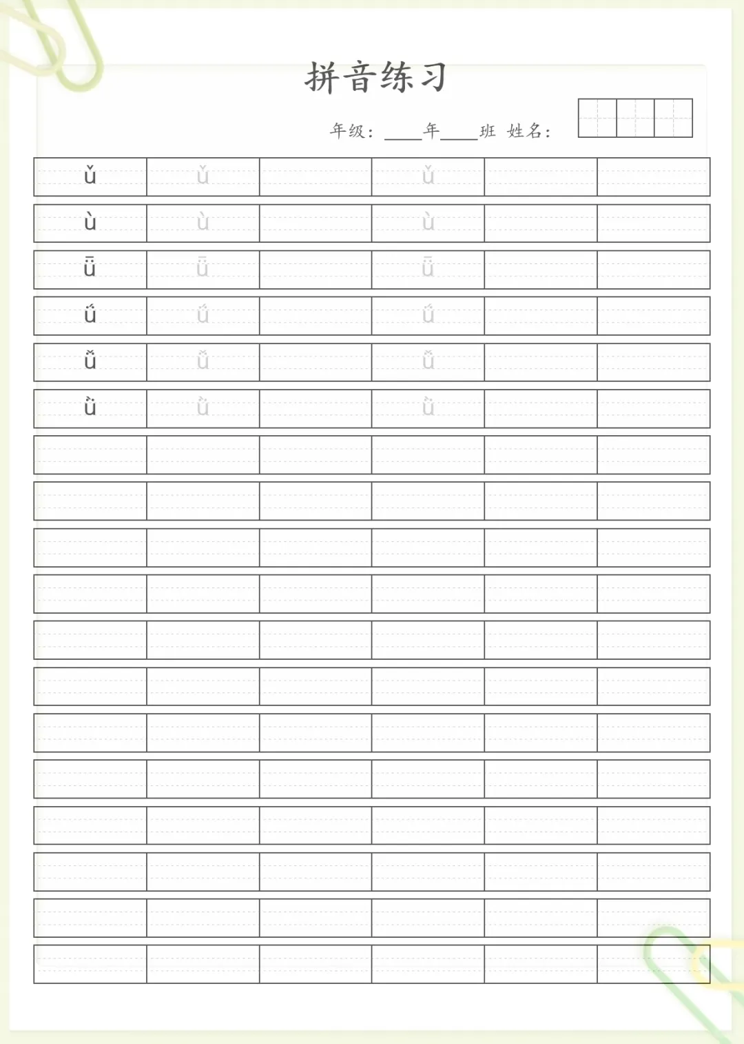 汉语拼音笔顺规范书写无水印资料,共7页,电子版可下载可打印,适合幼小衔接阶段孩子进行规范练习。这份资料围绕汉语拼音的笔顺规范书写展开,帮助孩子在启蒙阶段打好拼音书写基础,进一步熟悉书写顺序与书写规则,减少易错问题,养成认真、规范的书写习惯。需要的家长可以抓紧下载打印出来,让孩子及时练一练。