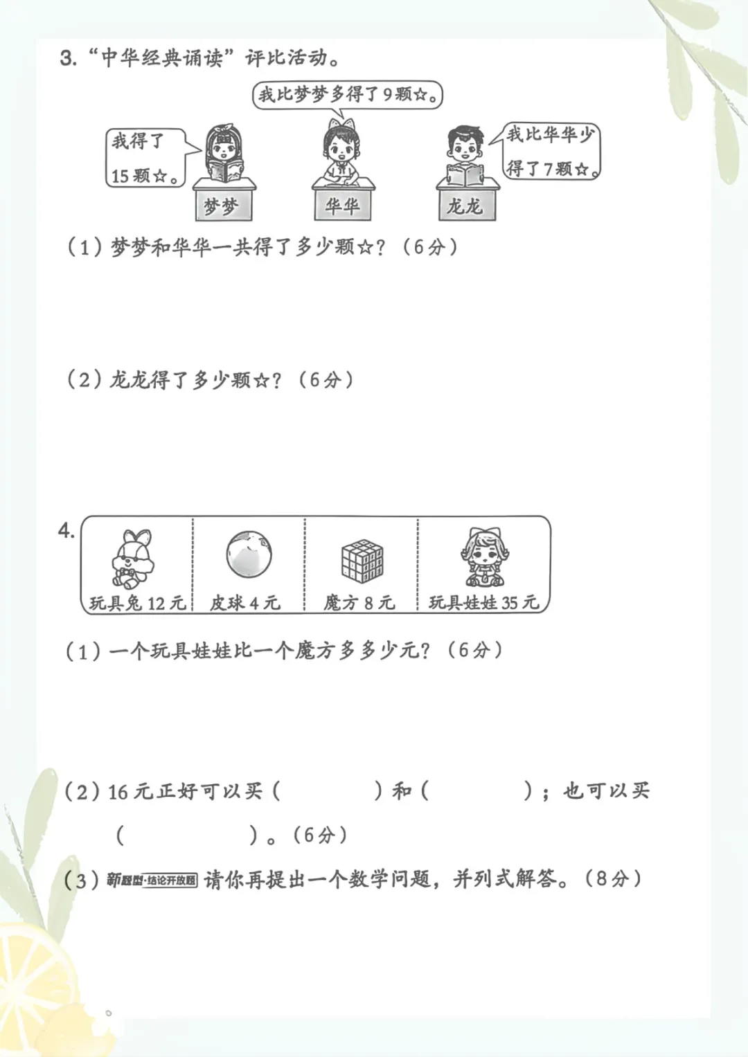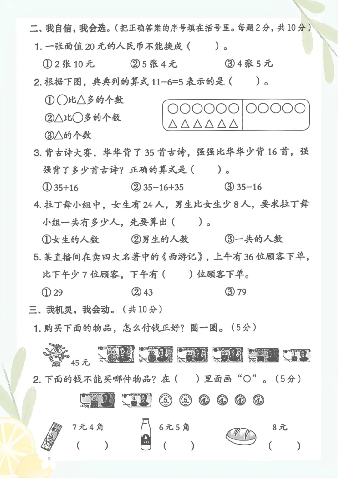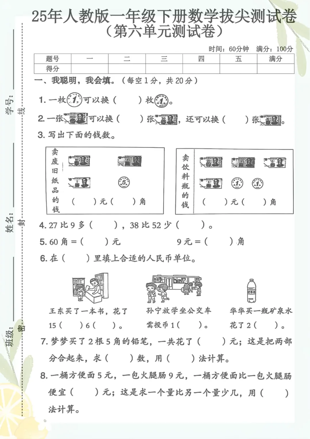 人教版一下数学第六单元拔尖测试卷,共5页,电子版可下载可打印,这份一年级数学专项练习紧扣第六单元学习内容,涵盖多个核心知识点与专项训练内容,题型设置有助于孩子巩固基础、提升理解与运用能力,也能帮助家长更有针对性地进行阶段检测与查漏补缺。需要的家长可以及时保存打印出来,让孩子练一练。