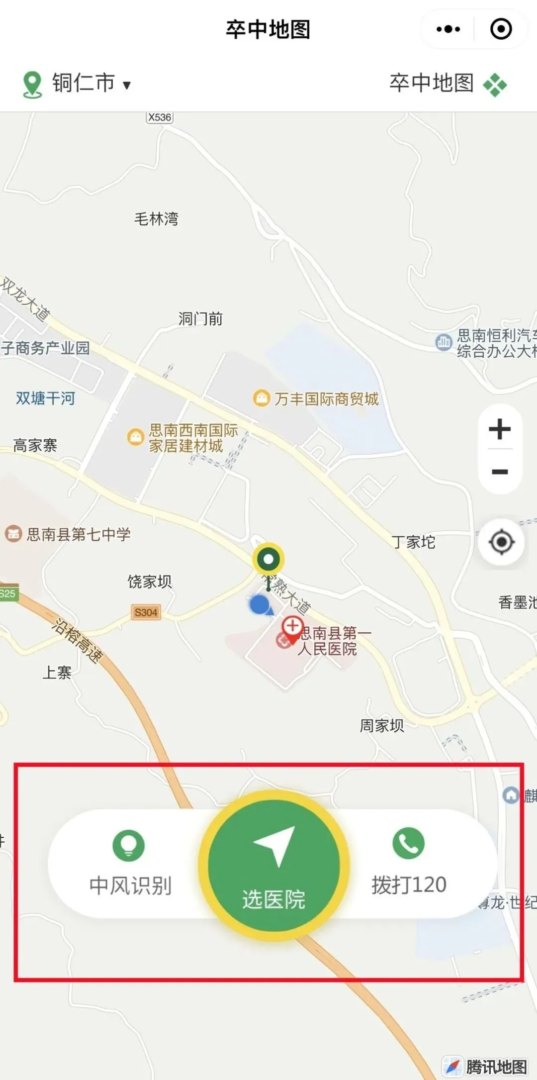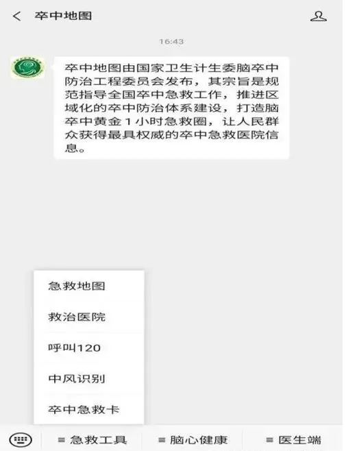 在菜单页点击急救工具,点击进入急救地图,随后可以看到“中风识别、选医院和拨打120”三个选项。