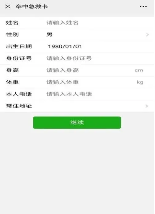 在菜单页点击急救工具,点击进入卒中急救卡,创建卒中急救卡完善个人信息。